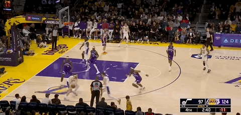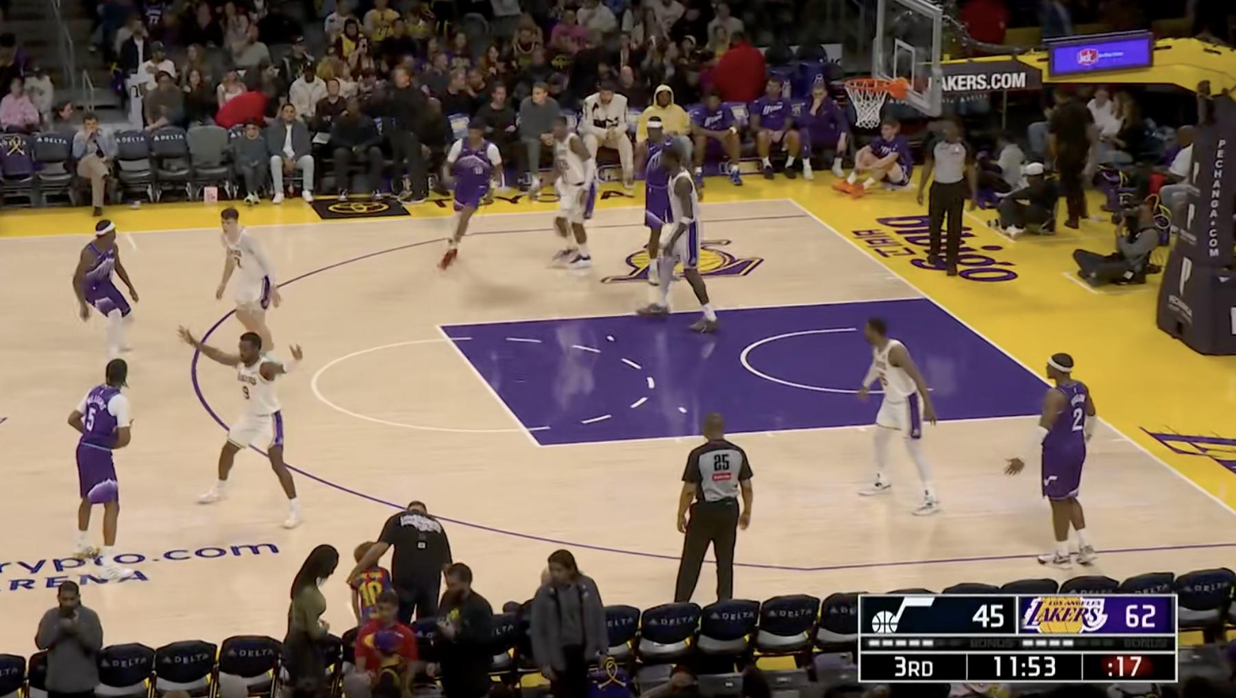 Bronny's playmaking ability is decent; he drove and dished, assisting Ayton for a finish. The first timeout of the second half arrived.