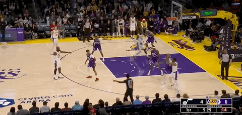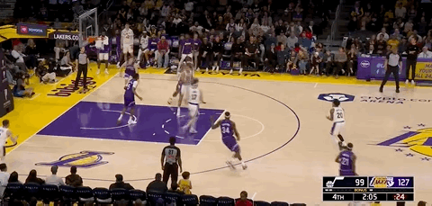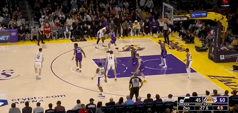 At halftime, the Lakers led 62-45 over the Jazz. James had 18 points, 4 rebounds, 6 assists, and 3 steals; Hachimura had 18 points and 7 rebounds; Ayton had 10 points, 7 rebounds, and 2 blocks; Smart had 5 points, 2 rebounds, and 5 assists; Kennard had 3 points; Vanderbilt had 2 points; Smith had 6 points; Laravia had 4 rebounds, 2 assists, and 2 steals; Kleber had 4 rebounds.