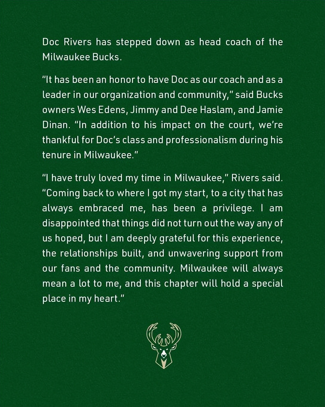 Bucks owners Wes Edens, Jimmy Haslam and Dee Haslam, as well as Jamie Dinan stated: "It was our honor to have Rivers serve as our head coach and as a leader for the team and community. Beyond his impact on the court, we also appreciate the grace and professionalism he demonstrated during his tenure in Milwaukee."