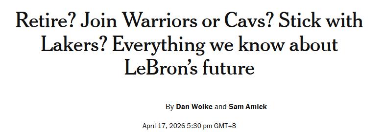 On April 17 Beijing time, according to The Athletic, multiple team and league sources granted anonymity revealed: James has not yet made any decision about his future, retirement remains a real option.It is widely believed that James would start a farewell tour season, but sources clearly denied the rumor: this claim is not true, multiple insiders stated they even heard James himself directly deny this idea.