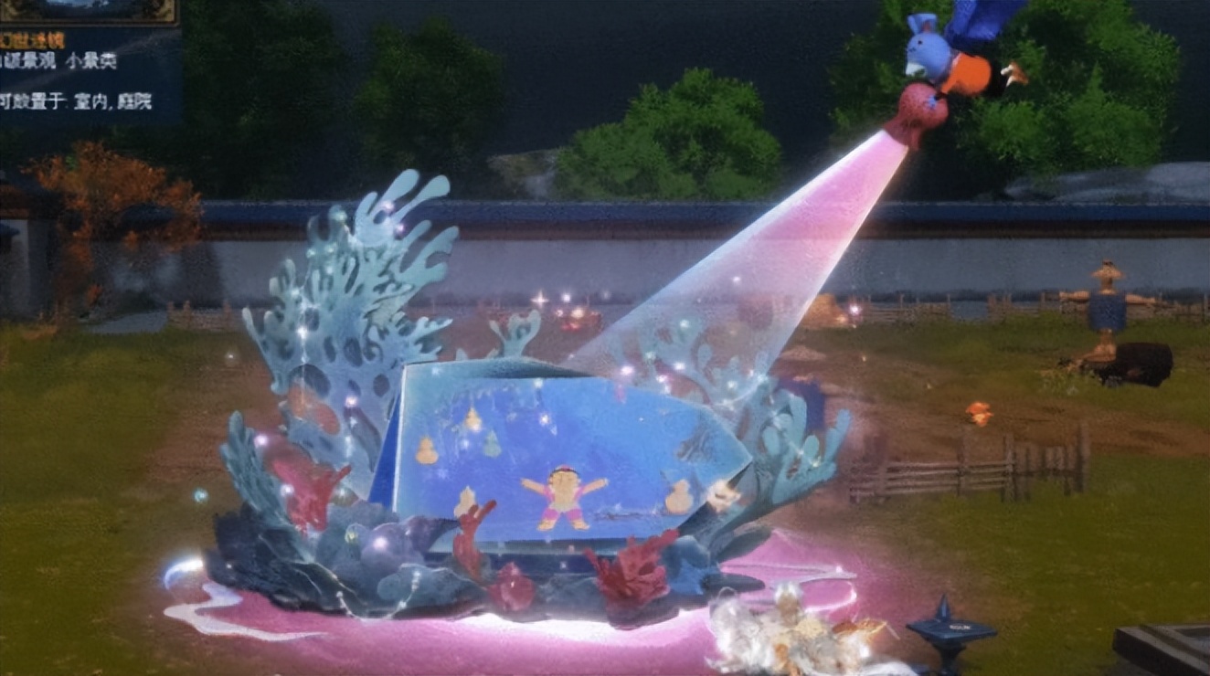 Besides playing the entire "Hulu Brothers" cartoon series, the appearance of the Illusory World Mirror furniture is sure to catch your eye. The giant stone mirror is crystal clear and icy, surrounded by layers of blue-purple coral clusters that glow faintly. Next to it, the stone table and stools have a rough texture, evoking a cool feeling and resembling the small stone stools where childhood friends once gathered. Honestly, you could sit there all day and watch the entire series!