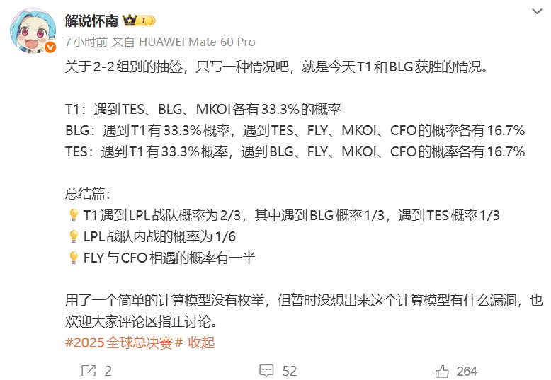 Commentator Huainan also analyzed the final round, estimating a 1/6 chance for an LPL internal match, while the probability of FLY facing CFO is relatively high. Under normal draw conditions, a China-Korea matchup is highly likely. Many viewers have asked if the organizers can arrange the draw to avoid matches like BLG vs. T1, but even with such arrangements, it’s impossible to completely prevent China-Korea clashes or internal matches.