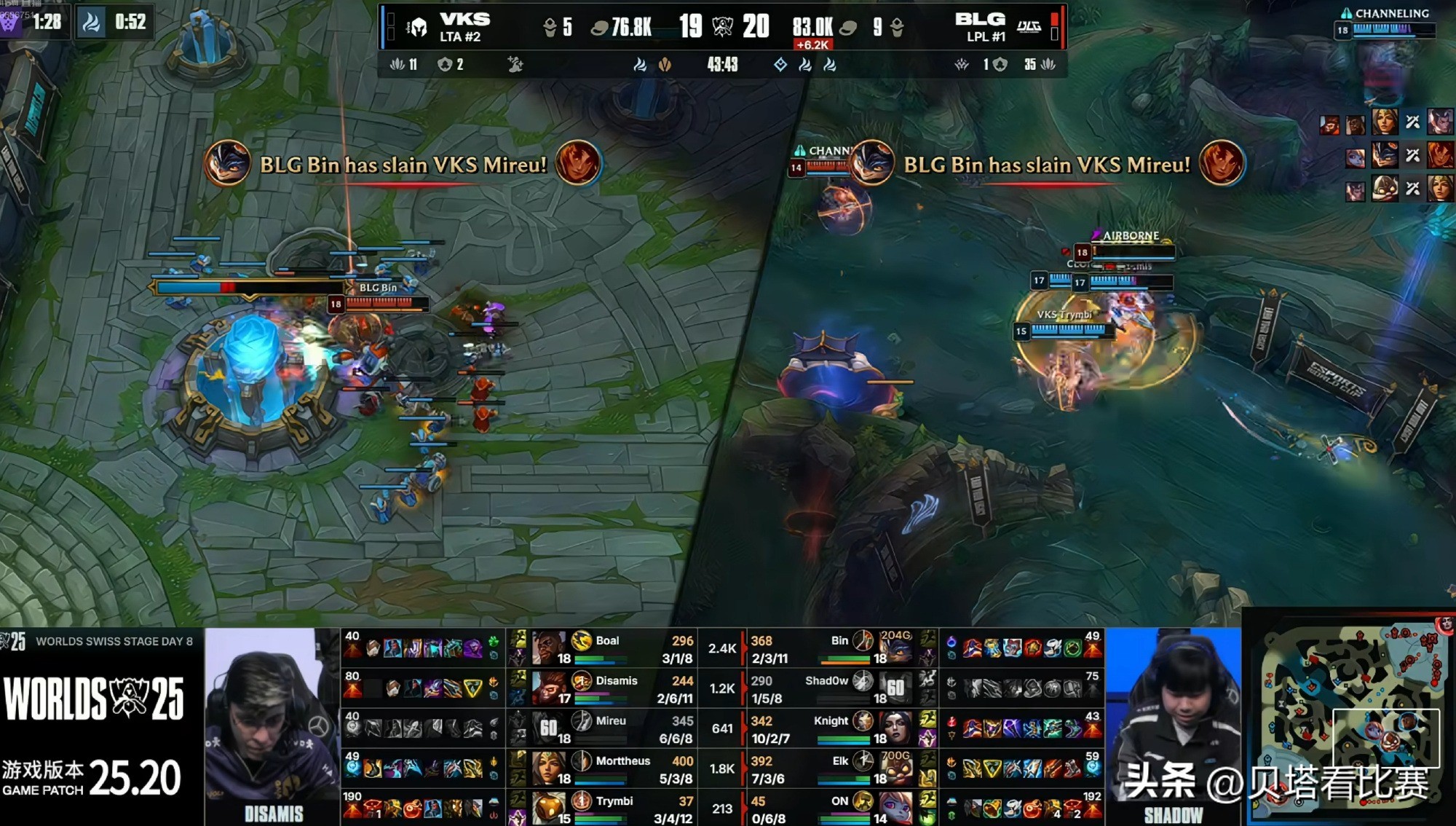 In the first game, BLG had Jax top, Troll jungle, Ziggs mid, and Kai'Sa with Neeko bot; VKS played Aphelios top, Qiyana jungle, Azir mid, and Varus with Bard bot. Early on, BLG’s top and AD swapped lanes, with ELK’s Kai'Sa soloing top against Aphelios, while Bin’s Jax and ON’s Neeko went bot. At 3 minutes, shadow’s Troll attempted a tower dive on Aphelios but failed, resulting in both the jungler and AD being killed. Aphelios secured first blood and a double kill. At 6 minutes, VKS’s Qiyana ganked bot but overextended; BLG capitalized on the turret to trade 1 for 2. Both sides exchanged plays early, with BLG taking the first tower on top lane, securing one dragon and the Rift Herald, leading by 1K gold.