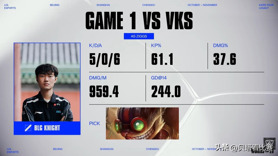 At 21 minutes in mid-game, BLG took down the Rift Herald. VKS initiated a team fight and heavily damaged BLG, but Azir’s mistake led to his quick death, allowing BLG to push and destroy VKS’s mid tower. At 25 minutes, BLG started Baron; VKS’s Qiyana’s attempt to steal failed and resulted in her death, leading to a 1-for-5 team wipe in favor of BLG. At 26 minutes, shadow's Troll solo killed Qiyana in the jungle. By 29 minutes, BLG took a dragon uncontested. Finally, at 29 minutes, BLG pushed from the jungle to the enemy base, killing four VKS members and securing the first game victory. Knight’s Ziggs earned the MVP.