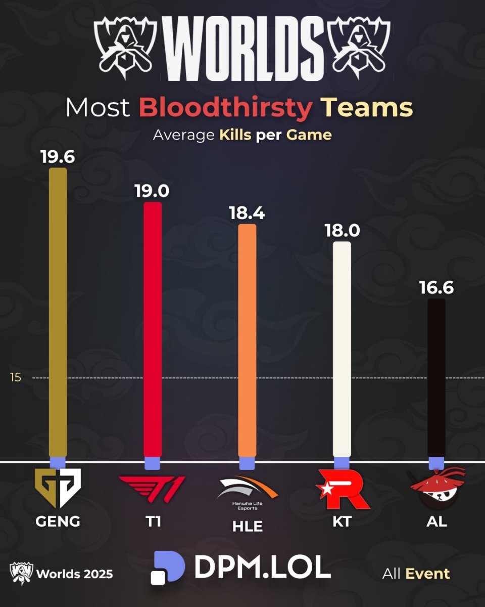Recently, foreign media compiled statistics on average kills per game during the S15 Swiss stage group matches. GEN, T1, HLE, and KT occupy the top four spots, while AL, as the last hope for the LPL, ranks fifth. From the performances so far, it’s clear that the LCK remains very strong, especially GEN, who show overwhelming dominance. With the current meta changes, the playstyle has shifted from the traditional style to more frequent team fights in the early and mid-game, greatly enhancing the viewing experience for fans!