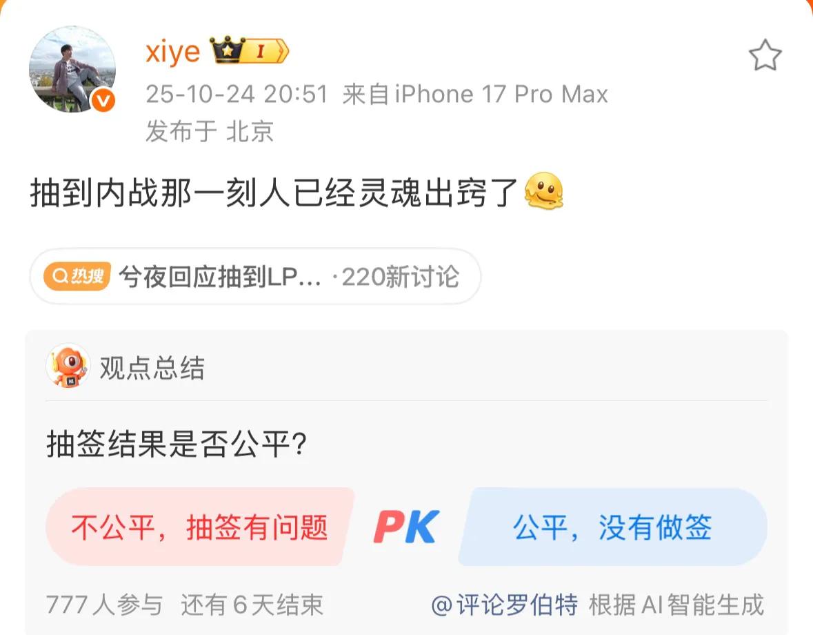 Xiye himself responded directly, saying that at the moment of the internal clash draw, he felt like his soul left his body. But in the comment section, most neutral LPL fans defended him, believing that Xiye helped secure an LPL quarterfinal spot. The disappointing outcome is blamed on BLG and TES themselves—one team couldn’t beat European and American teams, and the other was thoroughly crushed by LCK teams. Comparing the two teams’ overall strength, BLG definitely has the advantage since they won the regional championship. Meanwhile, TES has suffered consecutive defeats in recent BO3 matches, being swept 2-0 twice by LCK teams.