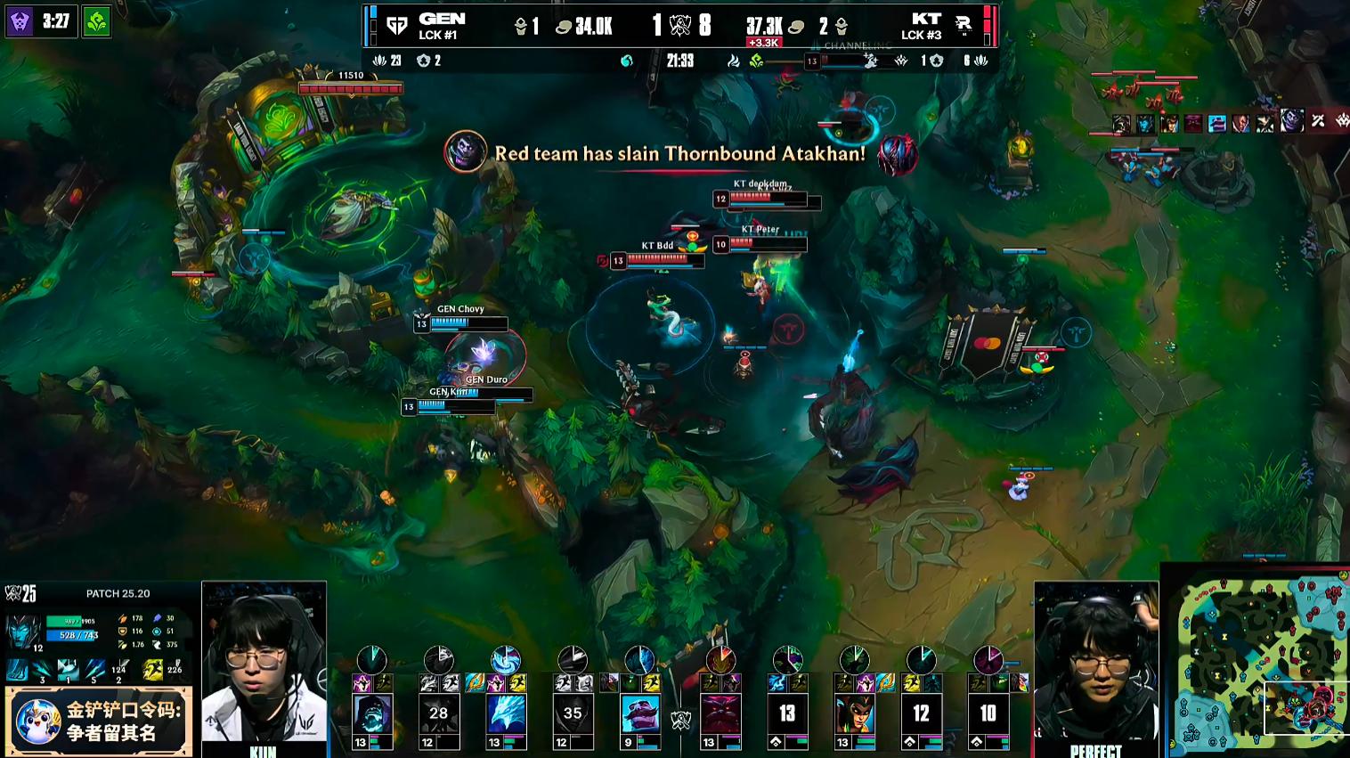 At 15 minutes during the Rift Herald fight, KT’s four-man squad was completely overwhelmed, with Ruler’s Ezreal securing a triple kill. Later, KT took the dragon and killed three GEN players, turning the tide from the earlier Rift Herald disadvantage. At 22 minutes, KT secured another dragon. A river team fight resulted in a 4-for-4 exchange, leaving only the top laners alive.