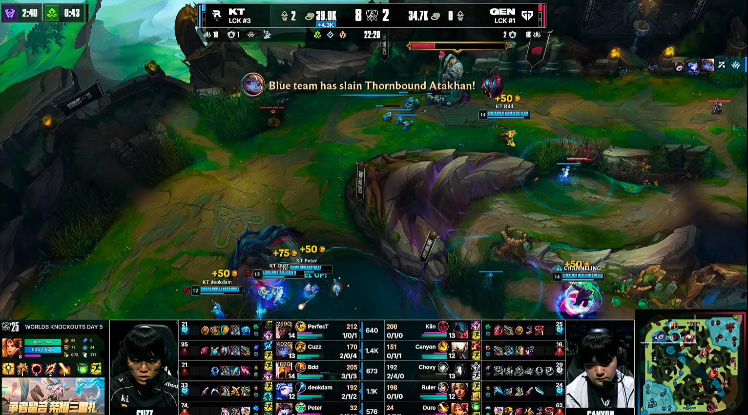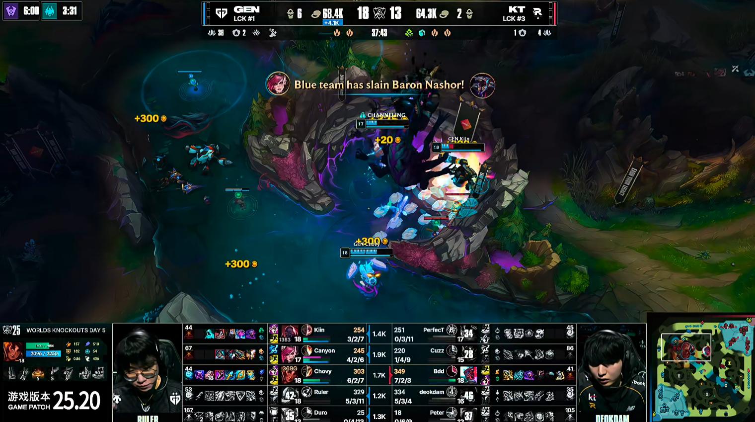 At 34 minutes near the base, both teams traded evenly with a 4-for-4 team fight, after which KT secured the Earth Dragon soul. Later, during the Baron contest, Canyon flanked and took down KT’s Rumble, giving GEN the initiation advantage. GEN defeated KT and secured Baron. Using the Baron buff, GEN pressured the base, but at 40 minutes Bdd decisively engaged, killing Chovy and Kiin, enabling KT to defend their base. KT then took both the Elder Dragon and Baron.