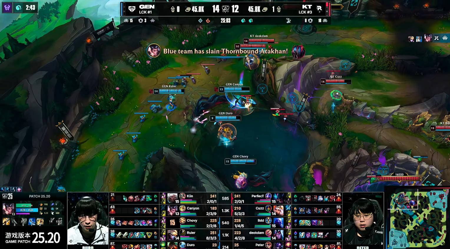 In the late game, GEN lacked sufficient damage to contend with KT’s three late-game carries and their double dragon buff push. With constant minion waves pressuring two lanes, GEN opted to engage defensively, but their direct damage output was no match. Ultimately, KT defeated GEN and won the first game.