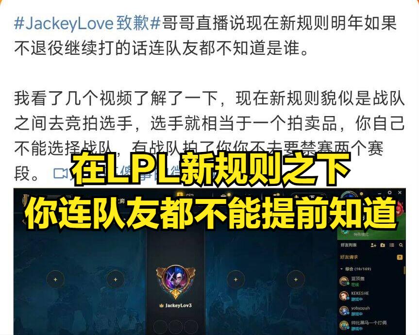 Finally, JKL complained about the new LPL transfer rules during the stream. He explained that in one month, players must participate in the LPL “auction.” If players do not join, they will be banned by the league. Therefore, JKL will decide within a month whether to continue playing professionally. (The new LPL rules are quite abstract, treating esports players like “auction items.” Players cannot choose their teams directly; if a team buys you, you must join. Refusing leads to a two-season official ban.)
