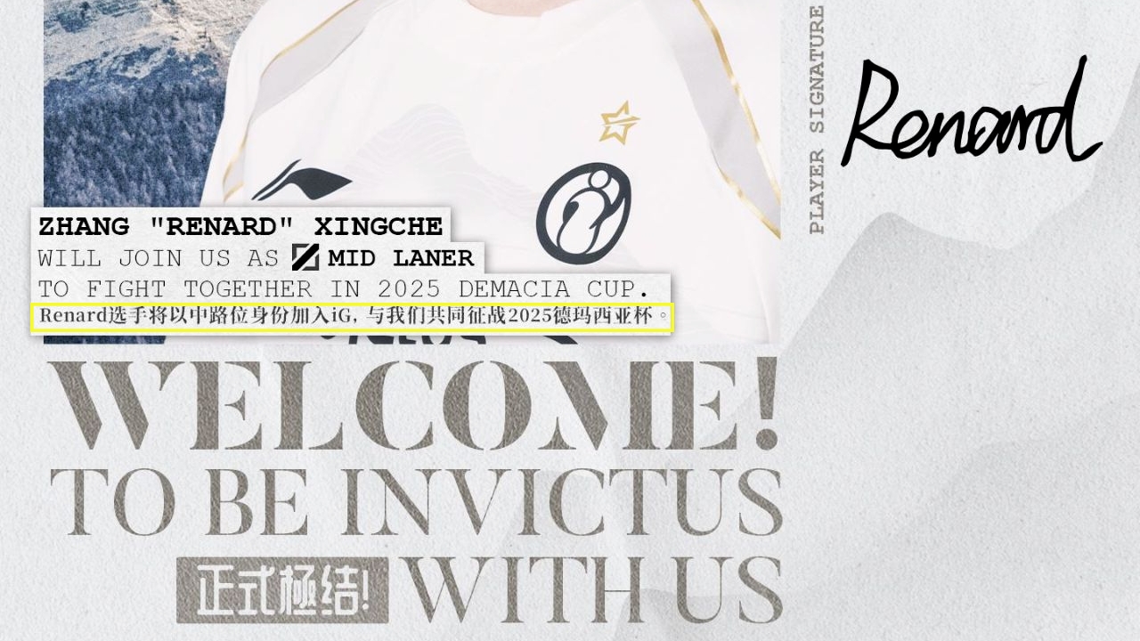 IG, which attracted a lot of attention during the transfer window, has officially announced their roster: Korean top laner Soboro, the young bot lane duo P and Jwei, and a temporary mid laner Renard. In the announcement image, IG specially added a note for this rookie: Renard joins IG as a mid laner to compete in the Demacia Cup with us. No other players were highlighted, indicating he is likely just loaned for the Demacia Cup.