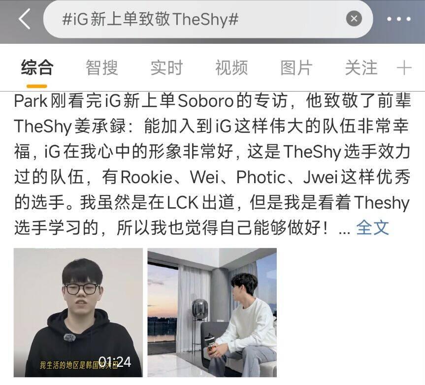 IG's official account recently released a video announcing the arrival of top laner Soboro. In the video, Soboro admitted that he became familiar with IG because of TheShy and ROOKIE. He also said watching TheShy's gameplay inspired him to switch to top lane during his youth training. Although Soboro is an LCK player, he has watched all of TheShy's match footage and feels fortunate to be TheShy's successor. Finally, Soboro expressed his commitment to fulfilling TheShy's wishes by playing alongside the veteran ROOKIE.