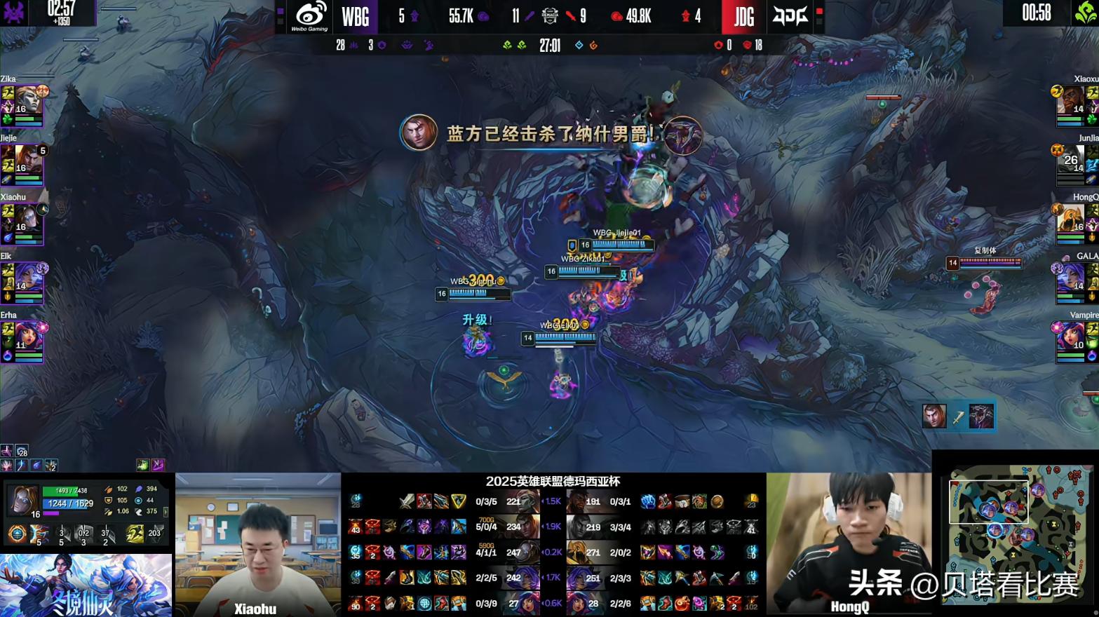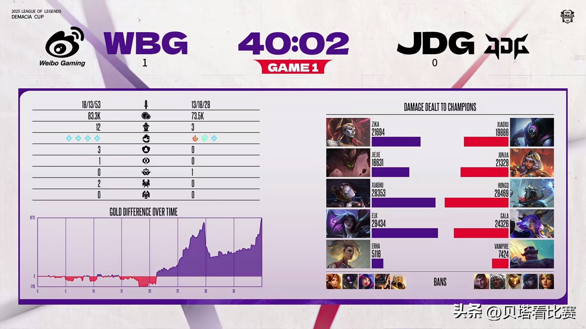 At 29 minutes, while WBG pushed top with buffs, Xiaoxu’s Jax initiated a fight; junjia’s Qiyana ulted onto ELK’s Kai'Sa, instantly killing her. JDG managed a flawless 3-for-0 exchange, halting WBG’s advance. Later, at 32 minutes, WBG secured the second Baron, but in the ensuing team fight, ELK’s Kai'Sa was killed again. JDG traded one for two and gained a dragon soul threat. At 38 minutes, Xiaoxu’s Jax was surrounded and killed by three enemies mid lane. WBG then chose to contest the Elder Dragon; ELK’s Kai'Sa stole it, and WBG pushed straight to win the first game. ELK’s Kai'Sa dealt the highest damage for WBG, while HongQ’s Viktor led JDG’s damage output.