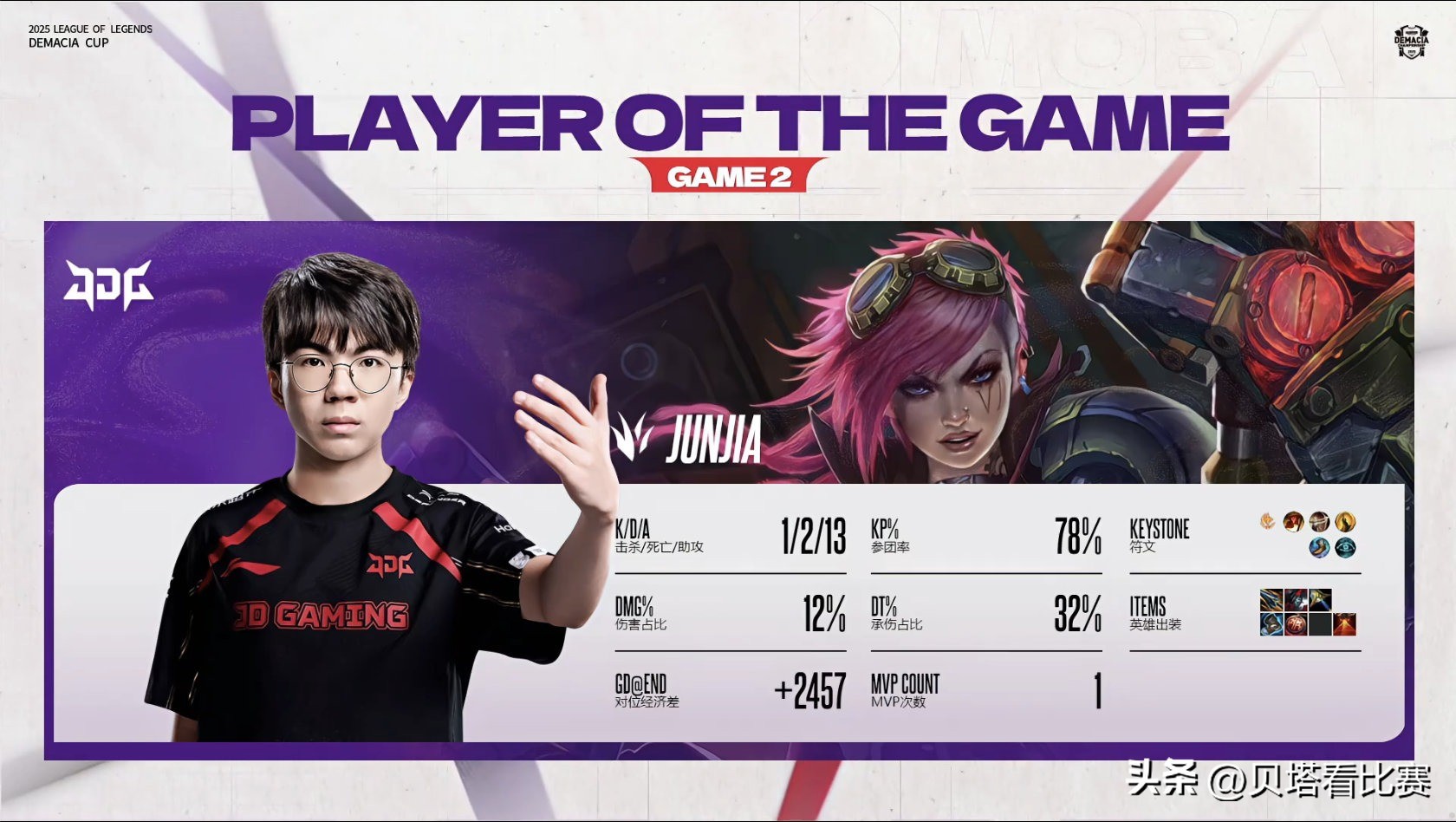 At 17 minutes, both teams contested the dragon; WBG started it, but Vampire’s Alistar engaged and forced WBG back, allowing JDG to claim the dragon soul threat. At 21 minutes, JDG swiftly secured the Elder Dragon. At 24 minutes, during another dragon fight, Xiaoxu’s Quasanti initiated on ELK’s Varus, while HongQ’s Taliyah stole the Dragon Soul. JDG won the team fight with a 4-for-1 exchange. At 26 minutes, Erha’s Poppy engaged on HongQ’s Taliyah but lacked damage, leading to JDG counterattacking, killing WBG’s top and jungle, and taking the first Baron. JDG ultimately won the second game, evening the series. The MVP was awarded to junjia’s Vi.