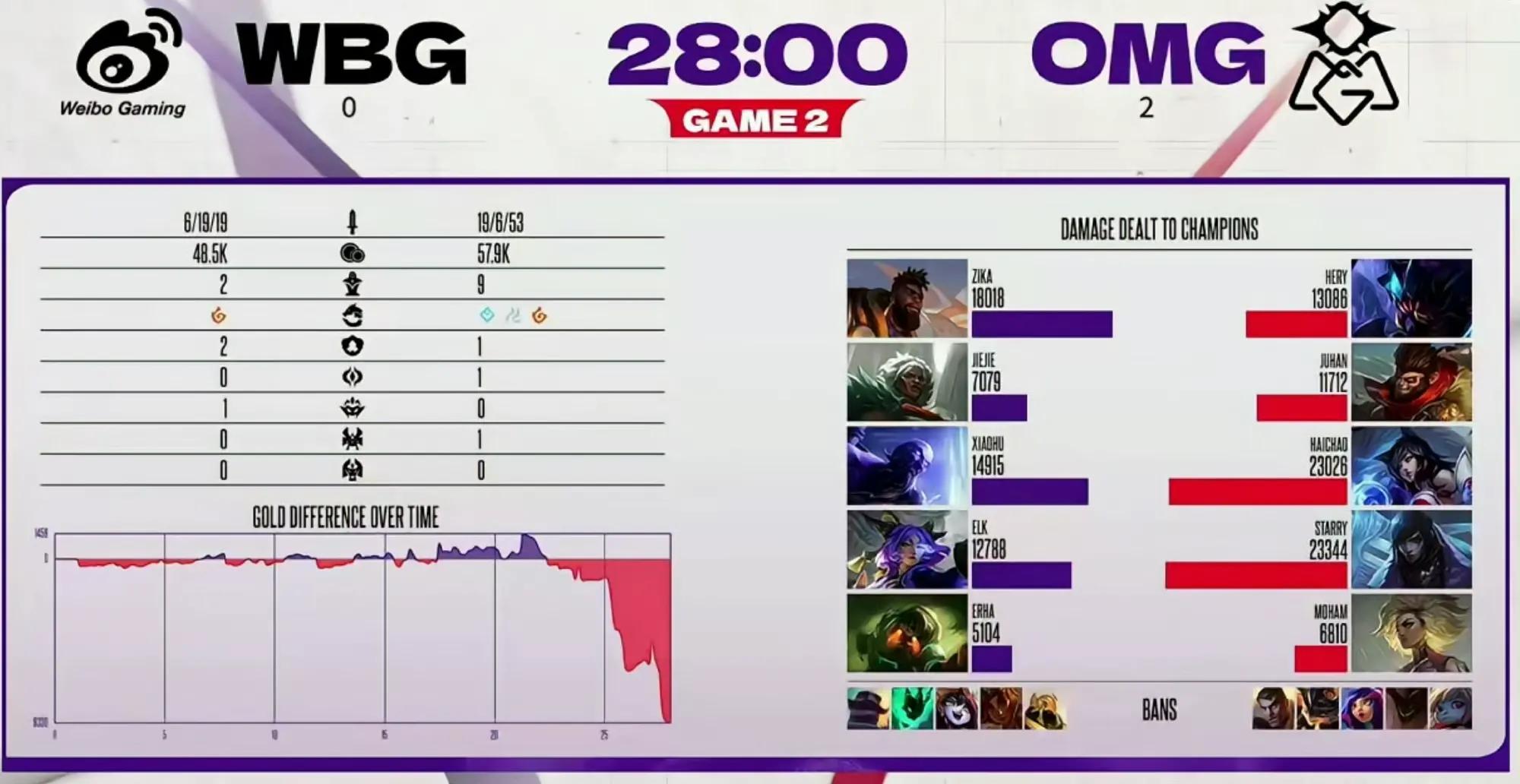 Against OMG, many fans expected WBG to win easily, but the two games ended with OMG completely dominating, winning effortlessly like a breeze sweeping fallen leaves. The first game started poorly: WBG attempted a three-versus-two tower dive but ended up losing two players in return. At seven minutes, Elk’s aggressive positioning was exploited by OMG’s bottom lane duo, resulting in a kill. By 15 minutes, OMG had fully seized control of the pace. The gap in the AD position kept widening, with OMG’s Caitlyn performing almost godlike. At 34 minutes, OMG comfortably took the first game.