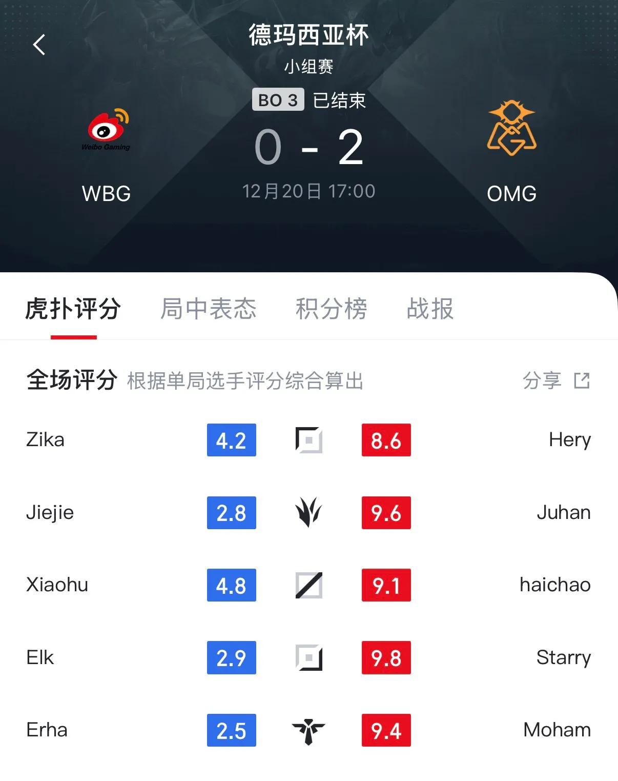 There was also a rather amusing moment in this match. In the second game, top laner Laohai was pushed into a desperate situation by the opponent’s Ahri. With only a sliver of health left, it seemed certain that Laohai would die, yet thanks to early-game stat advantages, he almost turned the tables and killed Ahri. If he hadn’t tanked a turret shot, it felt like Zika might have dived in directly. After the match, WBG’s ratings were quite awkward: mid laner Xiaohu scored the highest with 4.8, while support Erha was the lowest at just 2.5. Honestly, Erha is still a relatively young player, and his form is decent; many industry insiders even regard him as another potential K-Doctor.