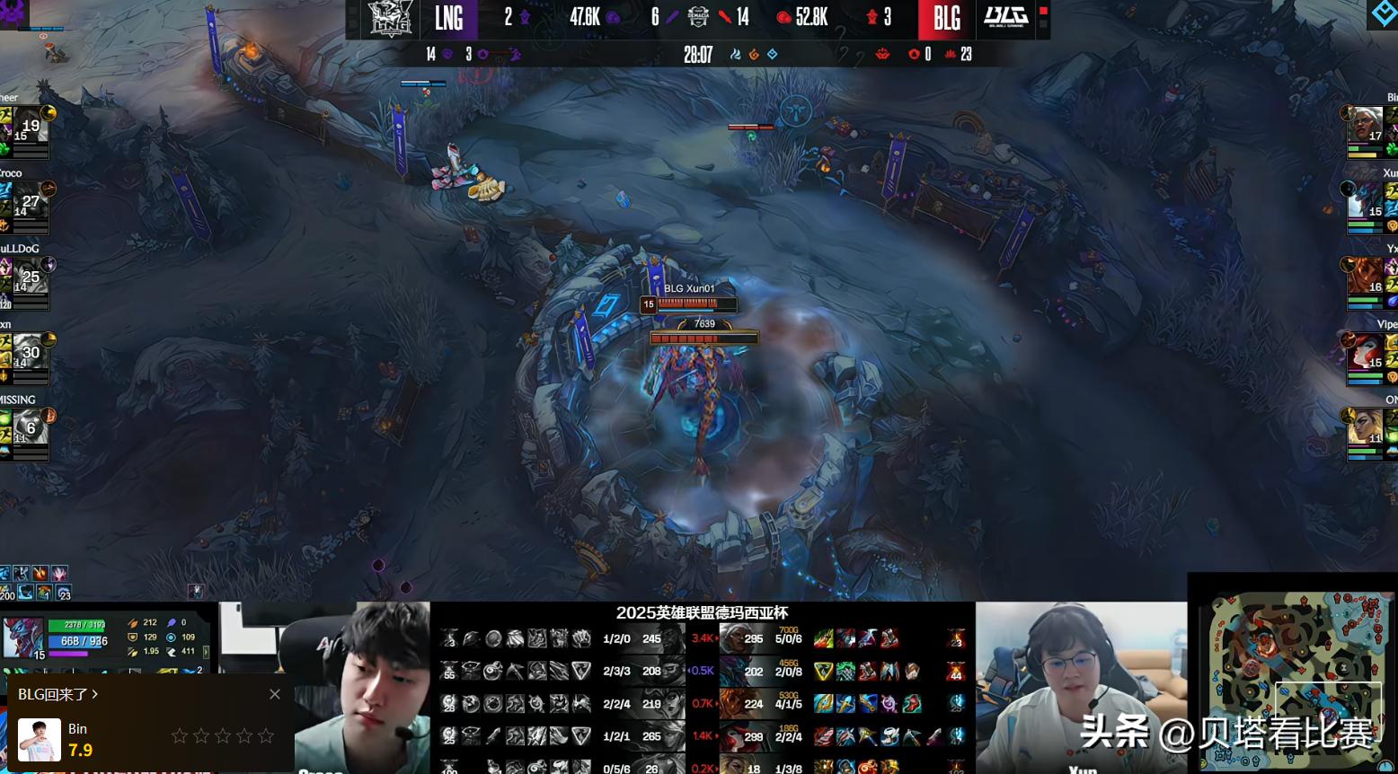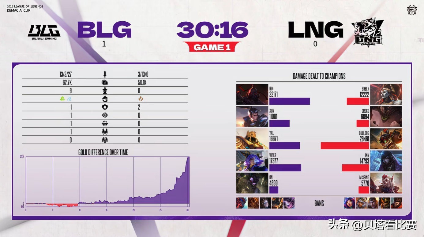 At 19 minutes in the mid game, BLG destroyed the first mid lane outer turret. At 22 minutes, BLG proactively contested the Rift Herald, trading one for one after a skirmish. At 27 minutes, LNG attempted to steal Baron Nashor, but BLG arrived, leading to a chaotic fight where BLG split the battlefield and came out with a 3-for-1 exchange, securing the first Baron. At 29 minutes, carrying the Baron buff, BLG pushed through the bot lane. Bin's Sion flashed and ults to collide with 1XN's Aphelios. BLG then killed four LNG members at the high ground and won the first game. The highest damage dealer in the first game was bulldog’s Ziggs, while bin’s Sion dealt the most damage for BLG.