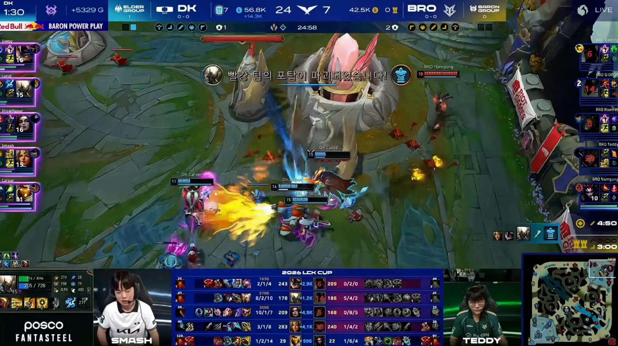 On LCK’s first day, BRO faced DK and sent out Roamer, attracting a lot of fan attention. Everyone was eager to see if this AI mid laner could perform well. However, Showmaker completely crushed this AI mid laner with his gameplay. While the enemy could resist a bit in the first game with Ryze, the second game with LeBlanc left no room for operation. Early pressure was established, constantly harassed by Orianna. Within just over ten minutes, Showmaker achieved three solo kills in lane and later built a Morellonomicon, instantly eliminating opponents with his three spells.