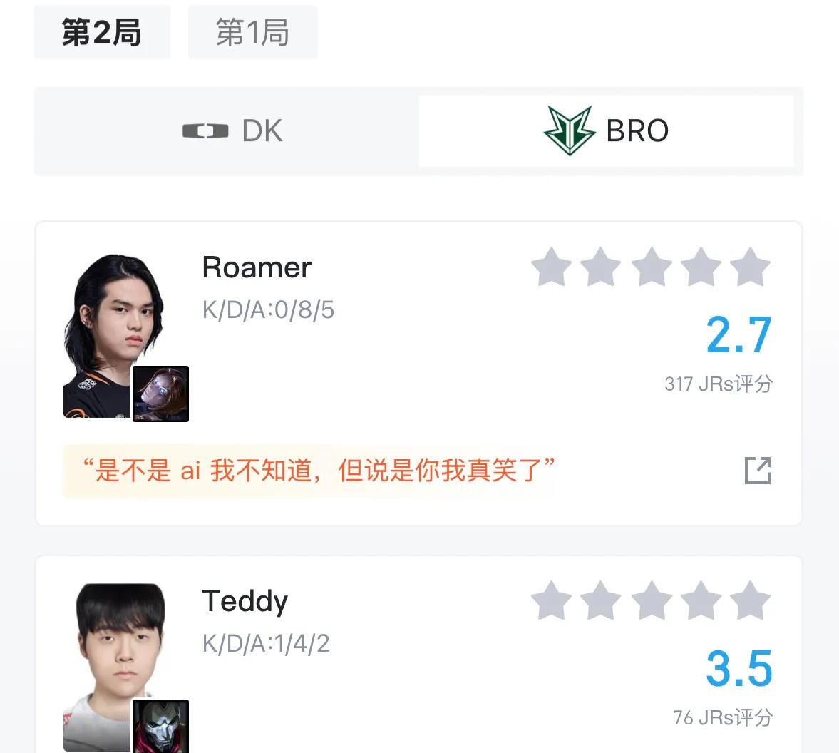 Most players are still very focused on the LCK region, whose overall competition strength has been impressive in recent years. Many teams have formed "galaxy squads," and any top-ranked team could easily compete for the LPL championship. As the LCK Cup officially started, the overall strength of the new season’s teams gradually became apparent, with the DK vs BRO match being very intense. It was expected to be evenly matched, but unexpectedly, DK dominated one-sidedly, and the highly anticipated AI mid laner completely fell apart, receiving a low rating of only 2.7.