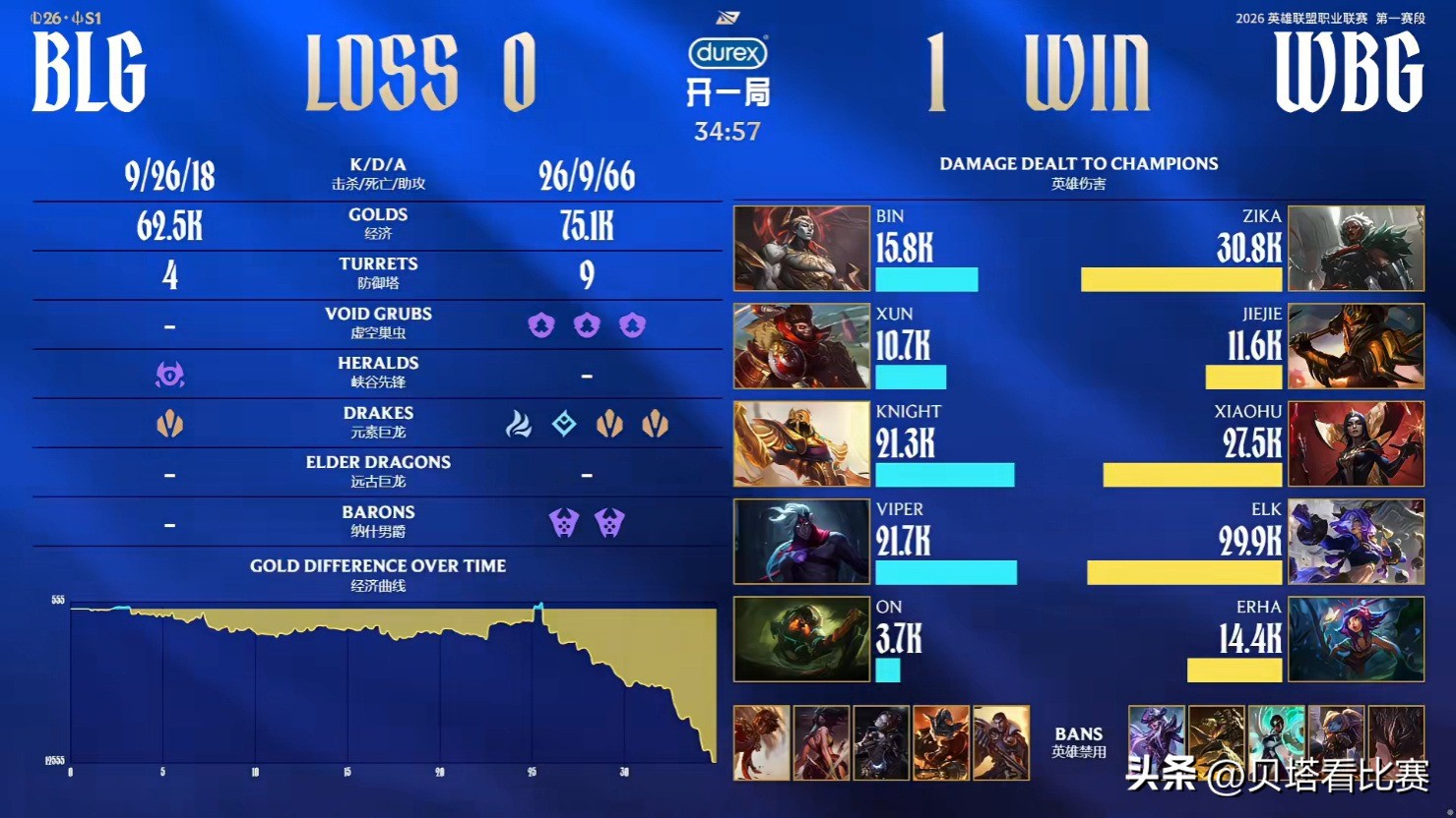 At 25 minutes, a major dragon pit teamfight broke out. ON’s Nautilus caught Xiao Hu’s LeBlanc with Q, instantly killing her, but Knight’s Azir missed his ultimate. Despite being outnumbered 4v5, WBG performed flawlessly, with ELK’s Yuumi cleaning up and wiping BLG 5-for-1, securing the first dragon. At 27 minutes, bin’s Yahang was instantly killed, and WBG claimed the Earth Dragon soul. Later at 33 minutes, Xiao Hu’s LeBlanc killed Viper’s Varus, but WBG responded with a 3-for-0 fight, taking the second dragon. At 34 minutes, BLG used all abilities on ELK’s Yuumi in the river but failed to kill her. WBG counterattacked perfectly, killing four BLG members and winning the first game. The highest damage dealer was Zika’s Anbesa for WBG, and Viper’s Varus led for BLG.