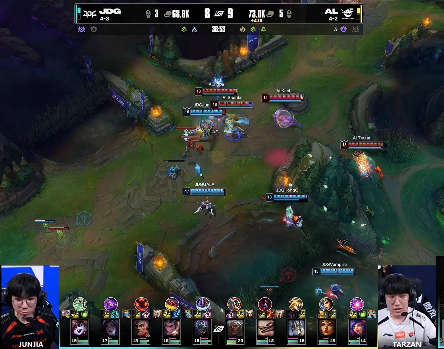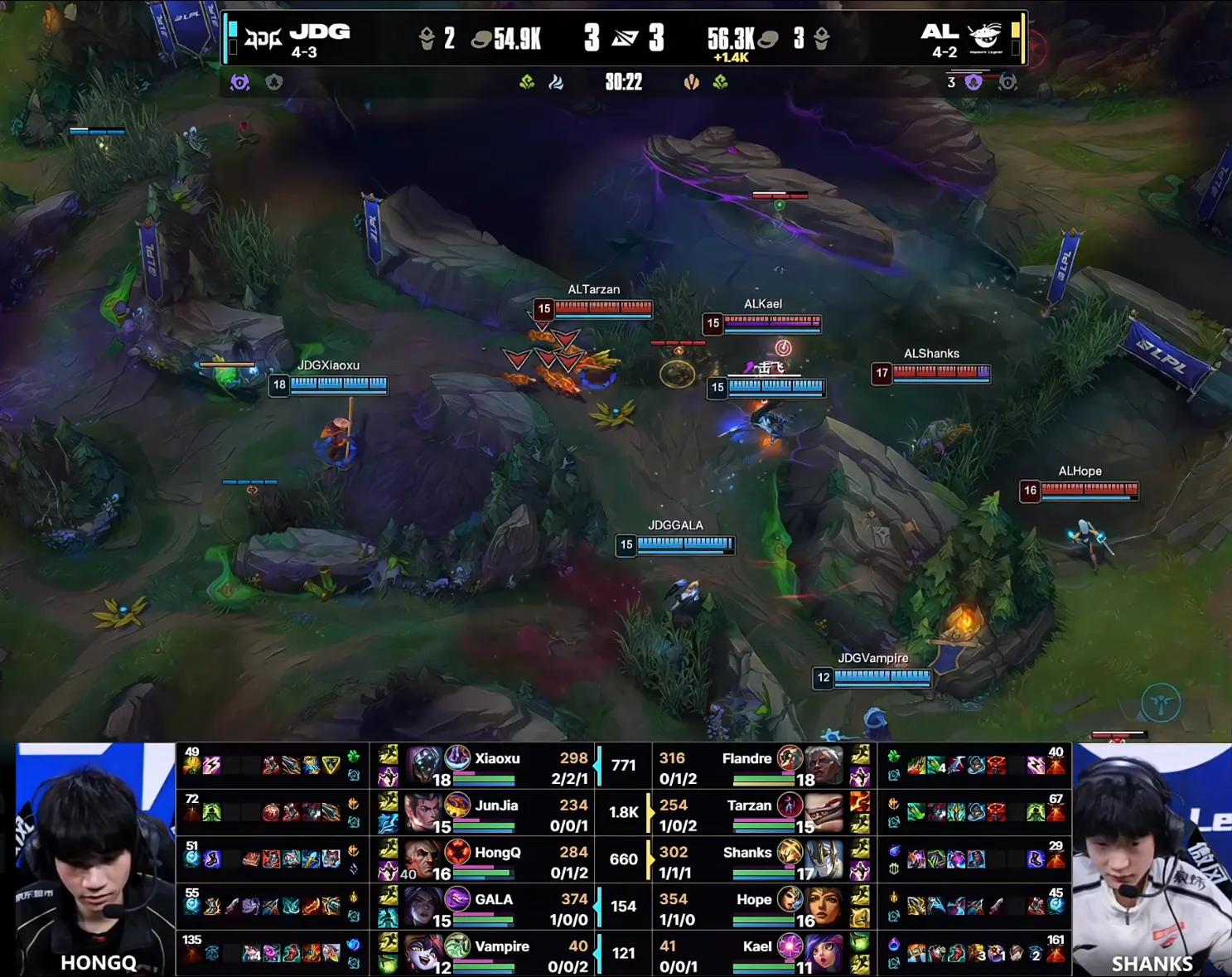 Most players are quite interested in JDG as a top-tier esports team. They invested heavily during the transfer period, and their performance this season has been decent, especially in the regular season where they double-killed BLG, leading many fans to believe they could be strong contenders this year. However, recent matches have revealed some issues. Their aggressive plays and the young players’ mindset have caused JDG to suffer. In the match against AL, they had a clear chance to win but were too impatient to start fights.