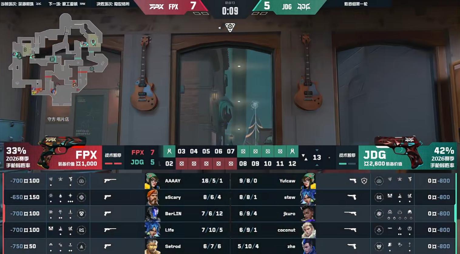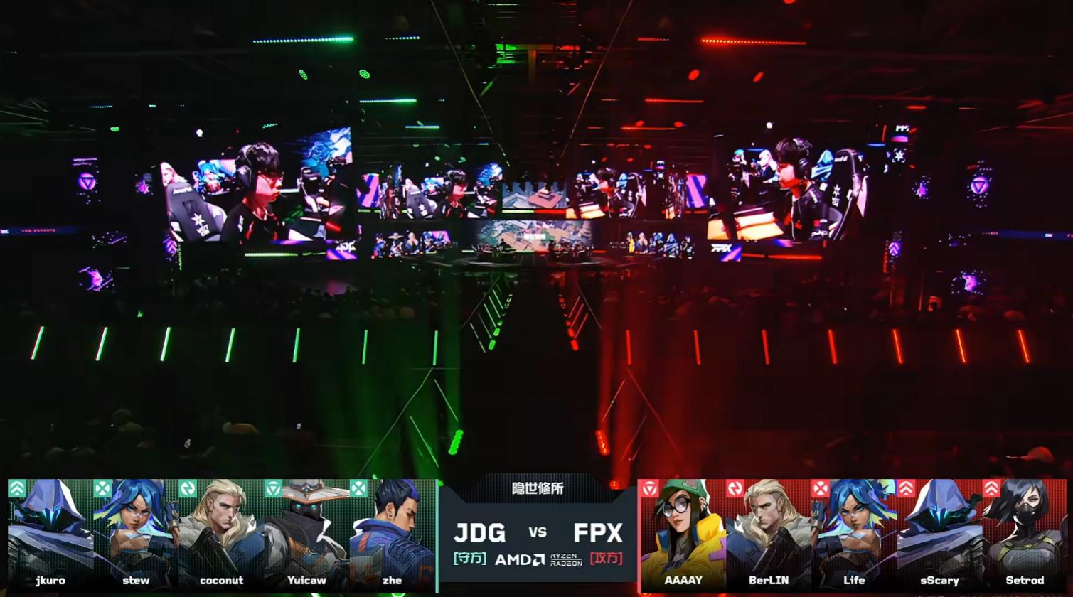 In the first half, JDG won the minor skirmishes; in round 3, FPX clashed with JDG’s heavy defense at site C, but Ayang eliminated JDG’s retake from the garage corridor to secure the round.