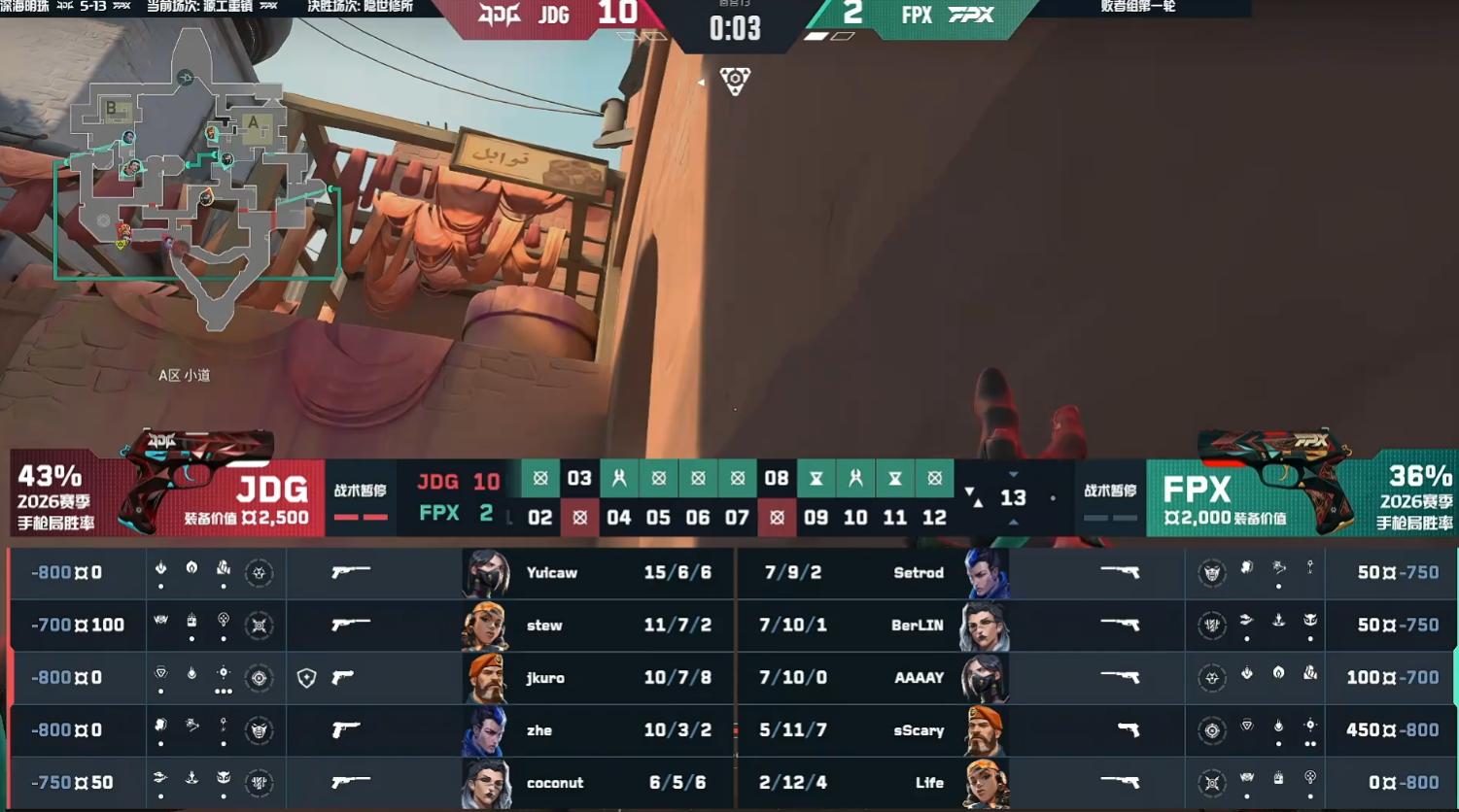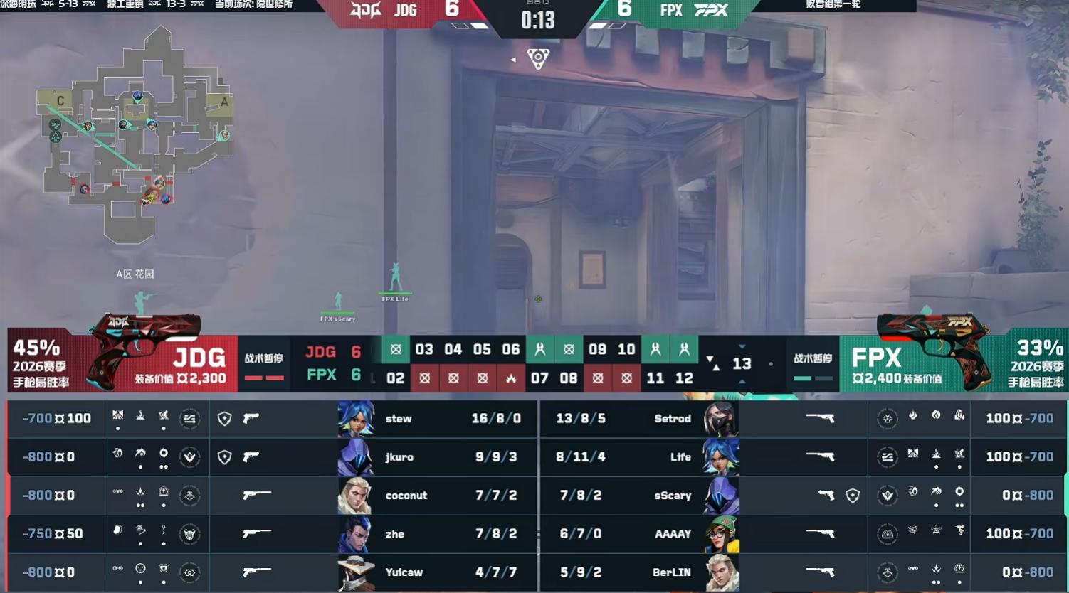 JDG scored three consecutive rounds; in round 6, JDG feinted at site A, then rushed to B after planting, FPX was outnumbered 2v3 but was outplayed by stew.
