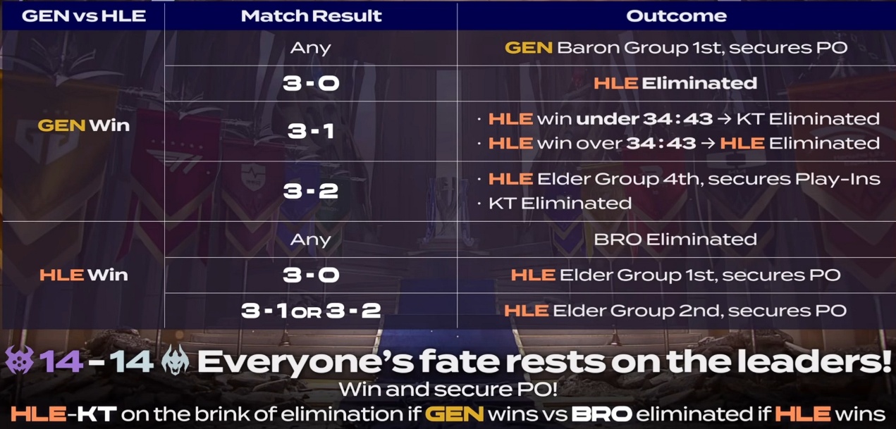 If HLE lost 1-3, the elimination would depend on game duration: if under 34 minutes and 43 seconds, KT would be eliminated; if longer, HLE would be out. If HLE either won against GEN or lost 2-3, they would qualify for the play-in stage.