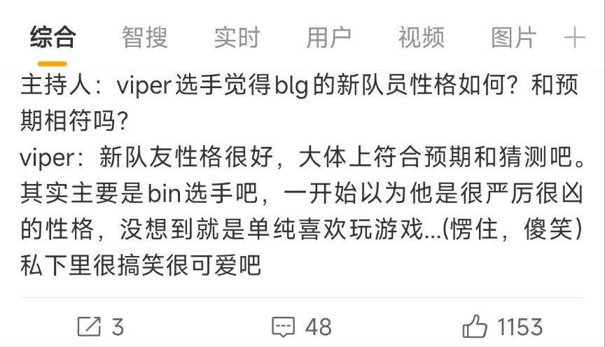 After BLG's dominant win over WBG, BLG's bottom lane AD carry VIPER took part in a post-match interview. During the interview, the host specifically asked Viper to comment on the personalities of the BLG players. Viper said that most BLG players were just as he expected, but Bin’s personality surprised him. At first, he thought Bin would be a very strict and irritable player, but after spending time with him, Viper found Bin to be easygoing and very cute.