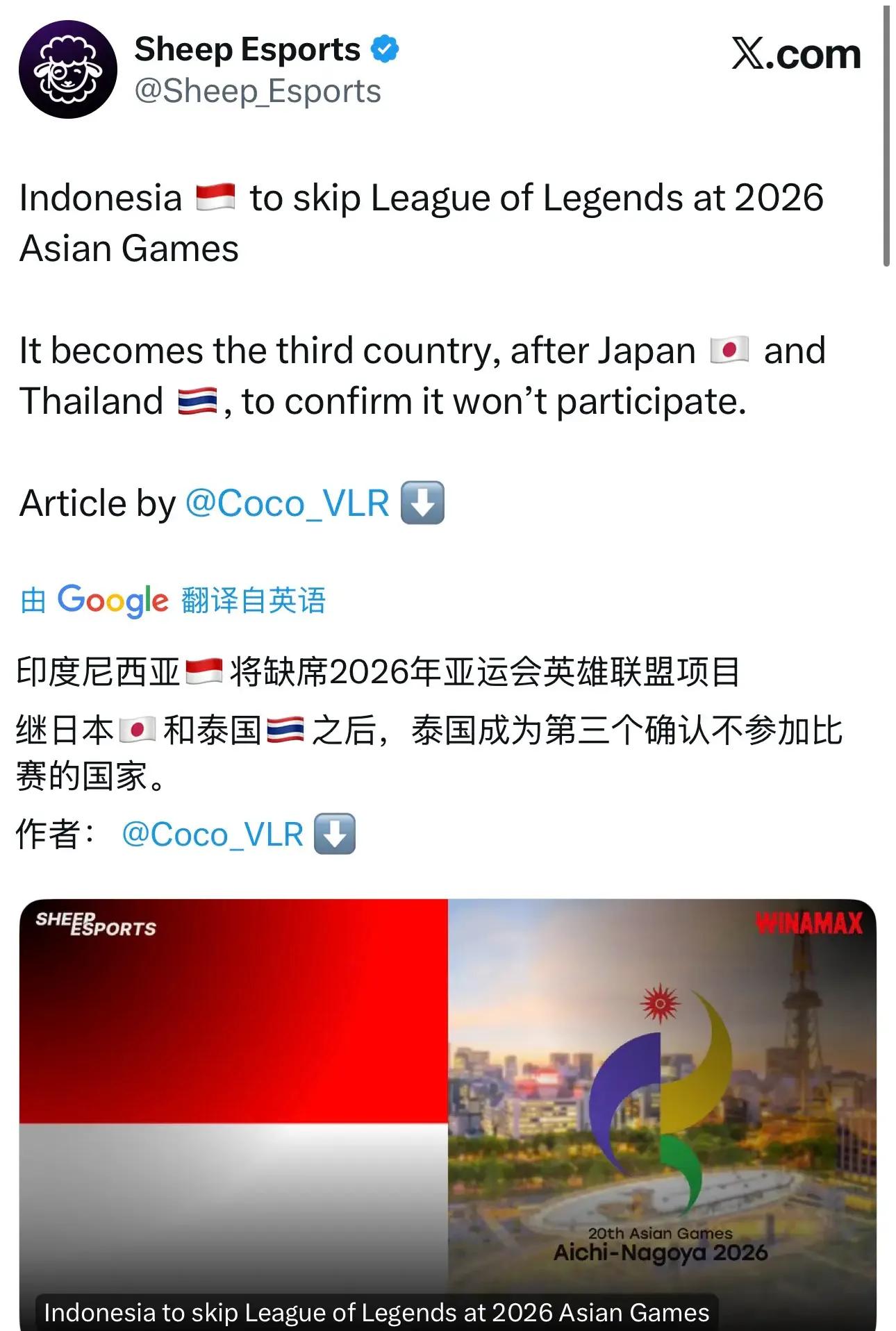 The AD carry position is very likely to be gala, since elk’s performance in the last competition was somewhat weak, indicating he may struggle under pressure in top-tier events. There are limited choices for support; Meiko is resting, Ming and Liu Qingsong have left the scene, so ON is probably the pick. While everyone was debating fiercely, more bad news emerged: Indonesia confirmed its absence from the 2026 Asian Games League of Legends event, becoming the third country after Japan and Thailand to withdraw. However, they will participate in other esports events. There are 11 esports disciplines in total this time, and League of Legends has seen the most withdrawals.
