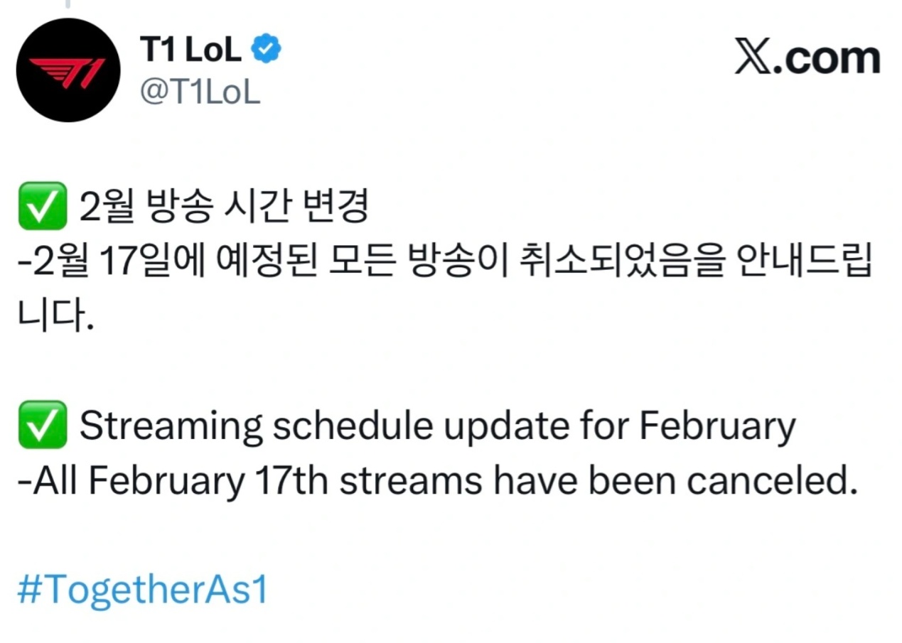 T1 has officially entered emergency mode, canceling the players’ scheduled live stream on the 17th to focus intensively on training.