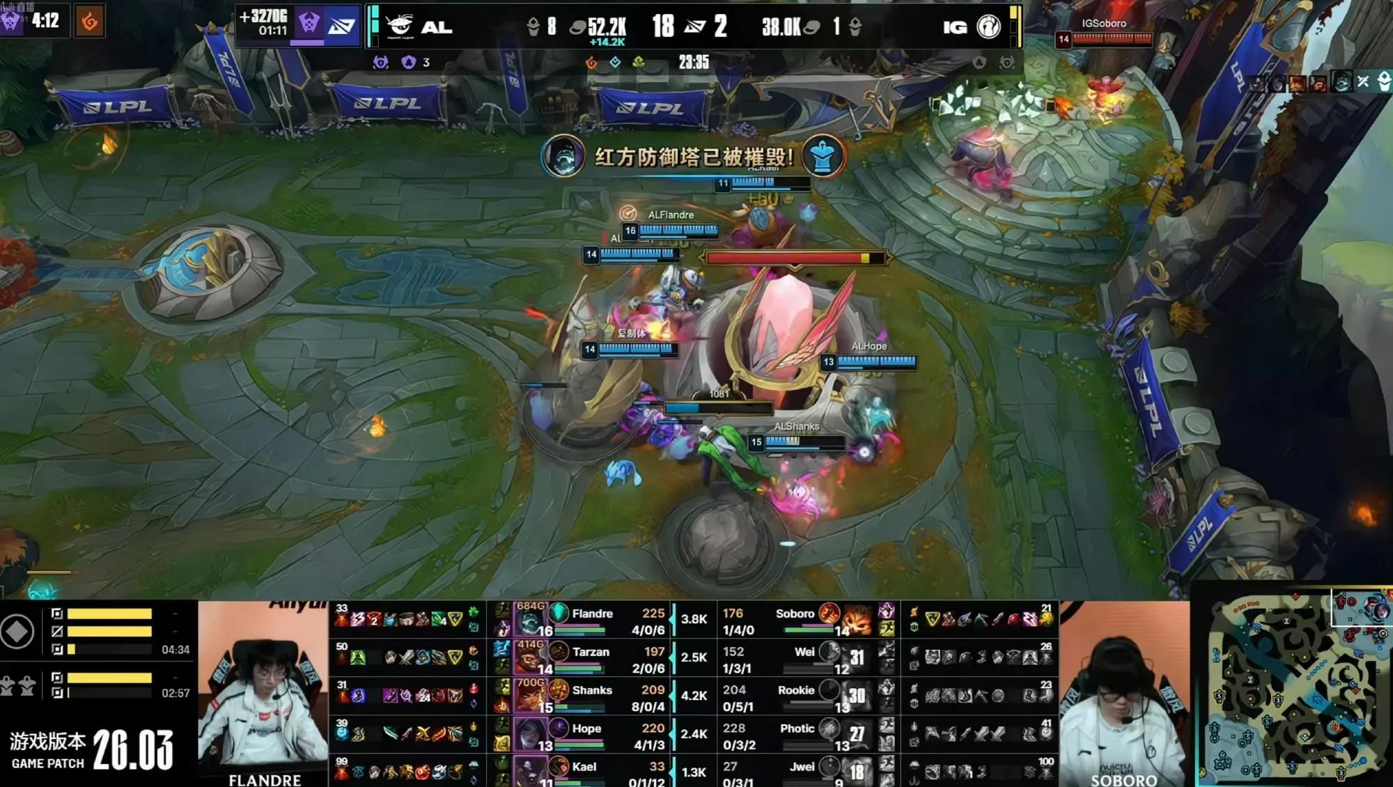 The match against AL team held little suspense. Before the game, many predicted AL would sweep IG 3-0. Unexpectedly, IG showed a strong performance in the second game. Early on, Flandre's Jayce was heavily targeted and repeatedly eliminated, while the rookie top laner's Renekton dominated, achieving a godlike 14-1-4 score. Wei's Jarvan IV had a perfect rhythm with a 4-0 record, earning the MVP. Many thought this signaled IG's comeback, but the subsequent games completely fell apart, especially the final one where Rookie was solo-killed by Xiangke just four minutes in, ending in a mere 23 minutes. AL won the series 3-1, eliminating IG from the remainder of the first stage.