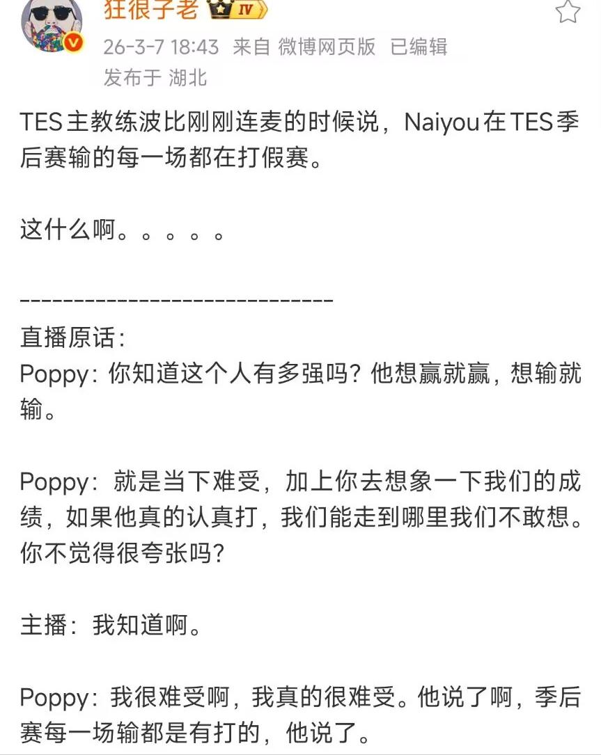 Recently, TES head coach Poppy revealed during a live stream interaction the story of TES "interrogating" Cream. Coach Poppy disclosed that from the start of the playoffs, Cream was "fixing" every match, even admitting that most of TES's losses were due to his intentional "feeding." Upon learning this, Coach Poppy was completely devastated and couldn't understand why Cream, with such high gaming talent, needed to engage in such activities.