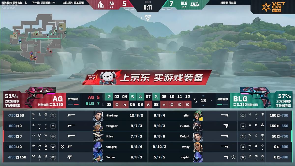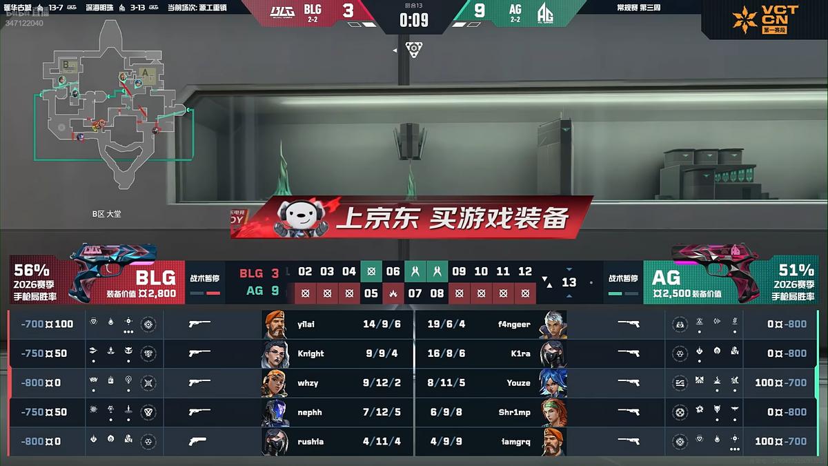 In the ninth round, after a chaotic fight, BLG narrowly recovered one round. In the tenth round, yilai secured a triple kill to help BLG tie the score, AG called a timeout.