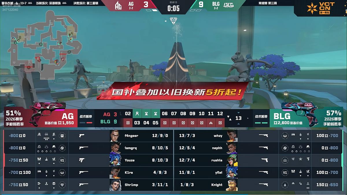 AG won the pistol round of the second half. In the fourteenth round, rushia secured a triple kill, BLG completed an eco round comeback.