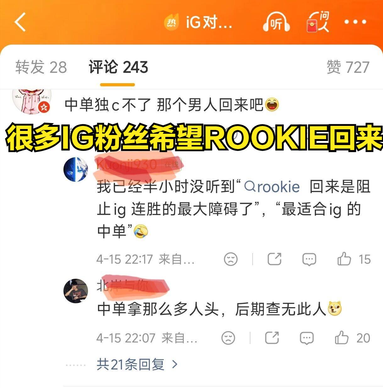 Following IG's narrow loss to WBG, many IG fans began longing for ROOKIE, especially since in this match, IG's new mid-laner Renard made serious errors with Orianna and LeBlanc. Many believe if ROOKIE had played Orianna or LeBlanc, IG likely would have secured victory, given that Renard, with a 2/0 start in the third game on a fed LeBlanc, was solo-killed by Xiaohu. Some IG fans think Renard's champion pool has issues, lacking proficiency with certain traditional mages compared to ROOKIE.