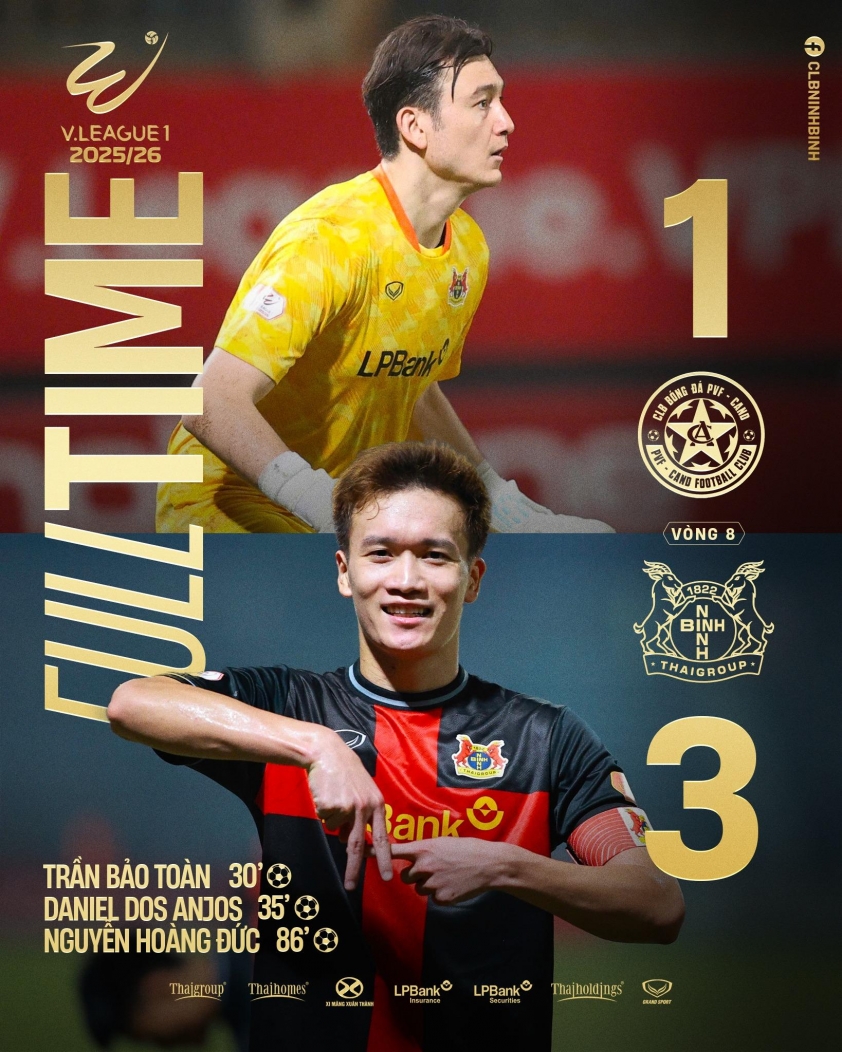 In the second half, the home side continued to fight hard, but the class of Geovane and Hoang Duc helped the Hoa Lu team secure a 3-1 win, maintaining their top position on the table and extending their unbeaten streak to 32 matches.