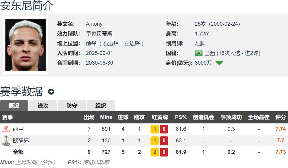 In the 11th round of La Liga, Antony, who joined Real Betis from Manchester United this summer for €22 million, scored twice and assisted once, single-handedly creating three goals to help Betis secure a 3-0 home victory over Mallorca, moving up to fifth place in La Liga. Antony missed the first three league matches and preseason but quickly regained form and confidence. In La Liga, he started all 7 appearances, scoring 4 goals and providing 1 assist; in the Europa League, he started both games, contributing 1 goal and 1 assist; totaling 5 goals and 2 assists in 9 matches, making him the team's top scorer.