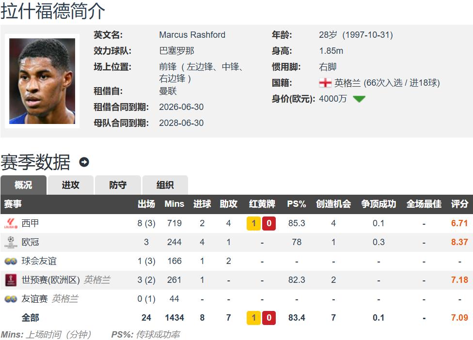 In the 11th round of La Liga, Rashford, who joined Barcelona on loan this summer, also scored, helping Barcelona to a comfortable 3-1 home win against Elche. Rashford has immediately revived his career at Barça this season, appearing 11 times in La Liga with 8 starts, scoring 2 goals and providing 4 assists; in the Champions League, he started all 3 matches, scoring 4 goals and assisting once; across all competitions, he has 6 goals and 6 assists in 14 games, topping both the club’s scoring and assist charts.