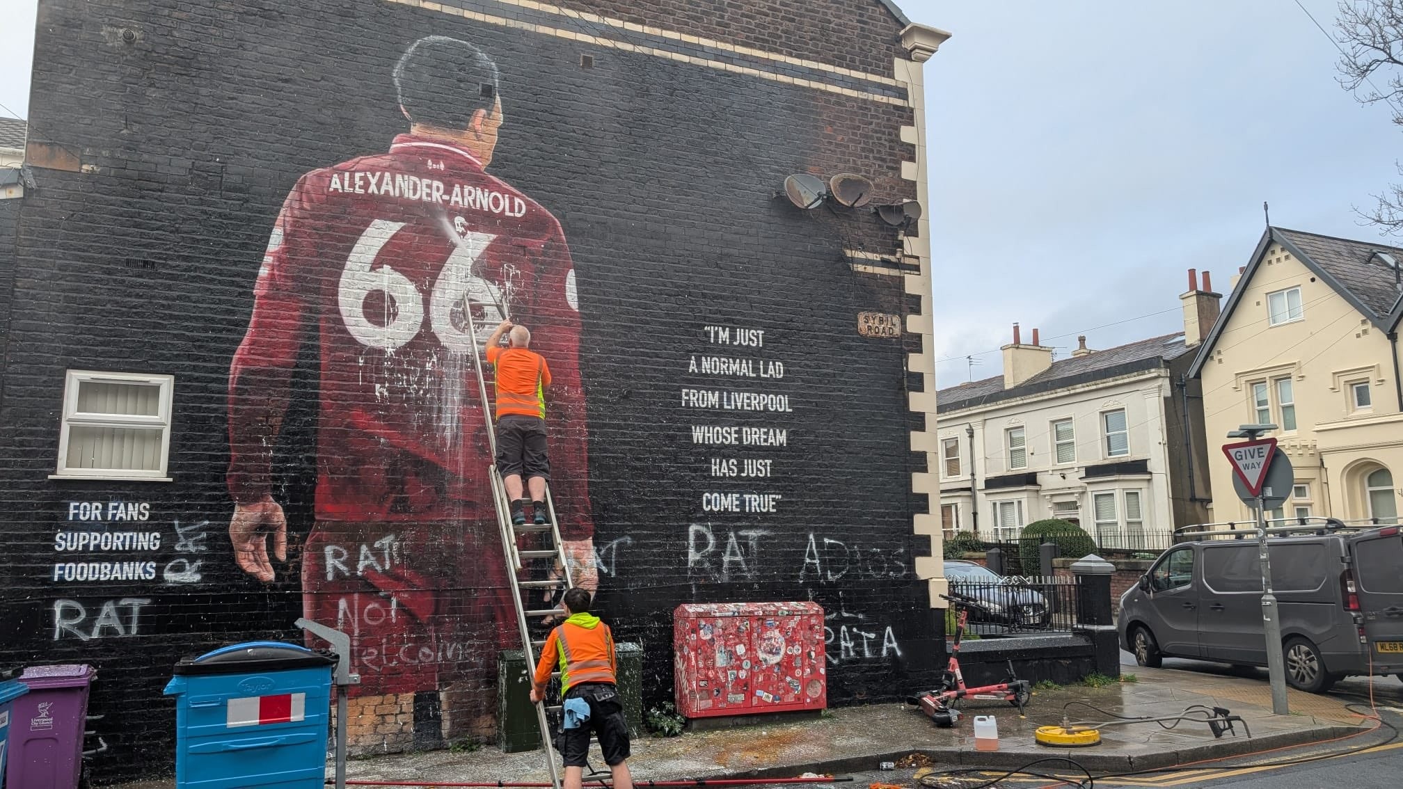 The mural, situated at Sybil Street corner and created by French graffiti artist Akse, shows Alexander-Arnold in a happy moment celebrating the 2019 Champions League win, along with his iconic phrase: "I’m just an ordinary boy from Liverpool, with a dream that has come true." However, the image is now covered with white paint and insulting words like "Adios El Rata" (Goodbye, rat) and other harsh remarks aimed at the former player.