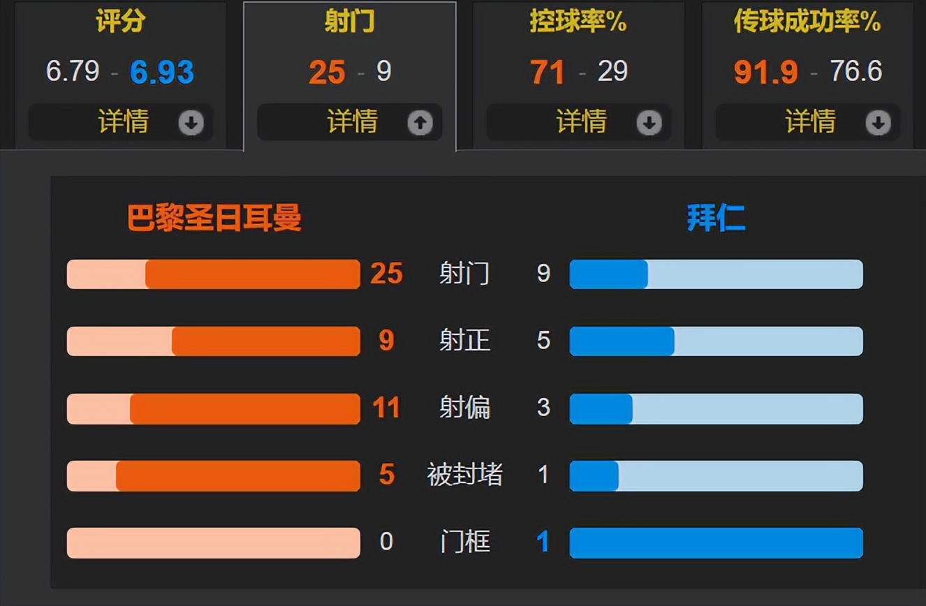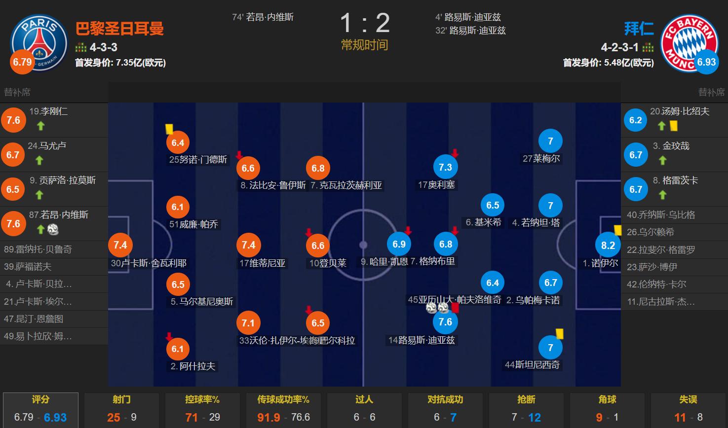 Throughout the entire match,PSG held 71% possession and fired 25 shots, 9 on target, while Bayern managed 9 shots with 5 on goal.PSG’s weakness remains the lack of a lethal top striker, with G. Ramos falling slightly short. The 39-year-old Neuer showed his enduring quality, earning the highest rating of 8.2 and proving to be the key player in Bayern’s 10-man victory over PSG.