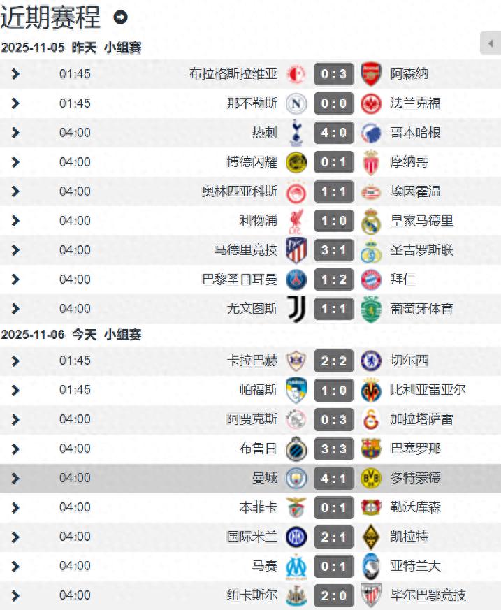 In the early hours of November 6 Beijing time, the fourth round of the Champions League group stage ended with nine matches completed the day before. This round saw Premier League clubs continue their strong form, with six teams achieving 5 wins and 1 draw, remaining undefeated. It’s clear that the Premier League is currently the top league. Meanwhile, five La Liga teams recorded 1 win, 1 draw, and 3 losses, with the two major clubs managing only a draw and a loss, showing a weak performance. Serie A’s four teams remained unbeaten with 2 wins and 2 draws.