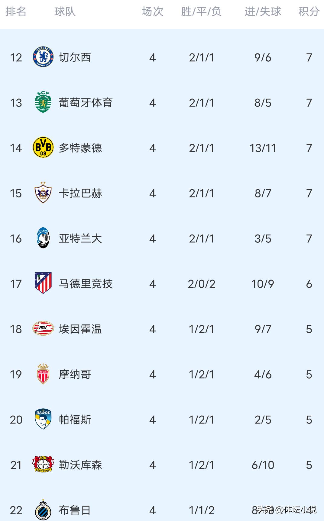 On November 6th Beijing time, the fourth round of the Champions League wrapped up. In the latest matches, Chelsea shocked many by drawing 2-2 with the underdog Qarabağ, Manchester City dominated with a 4-1 thrashing of Bundesliga giant Dortmund, Inter Milan, despite struggling, edged out weak Almaty Kairat 2-1, and Barcelona was unexpectedly held 3-3 by Club Brugge. Consequently, the updated table places Inter Milan third with four wins in a row, Manchester City fourth unbeaten after four games, and Barcelona sitting at 11th place!
