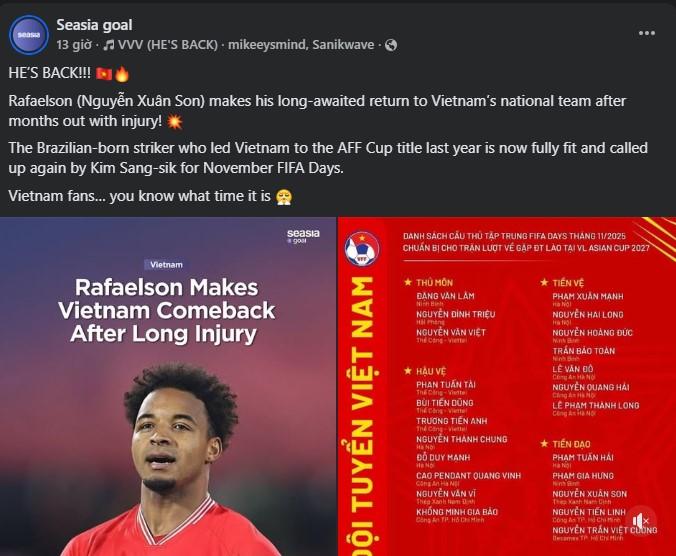 The post included the following excerpt: "He’s back!!! Rafaelson (Nguyễn Xuân Son) officially rejoins the Vietnam national team after months off due to injury! The Brazil-born forward, who played a key role in Vietnam’s AFF Cup victory last year, has fully recovered and has been called up by coach Kim Sang Sik for the November FIFA matchdays. Vietnamese fans… you know what’s coming!"