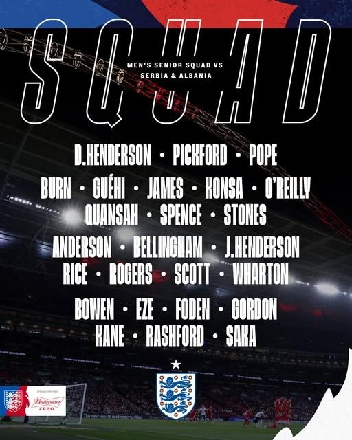 The England squad for the last two qualifiers of the 2026 World Cup has been revealed, with the absence of wing-back Lewis-Skelly standing out.