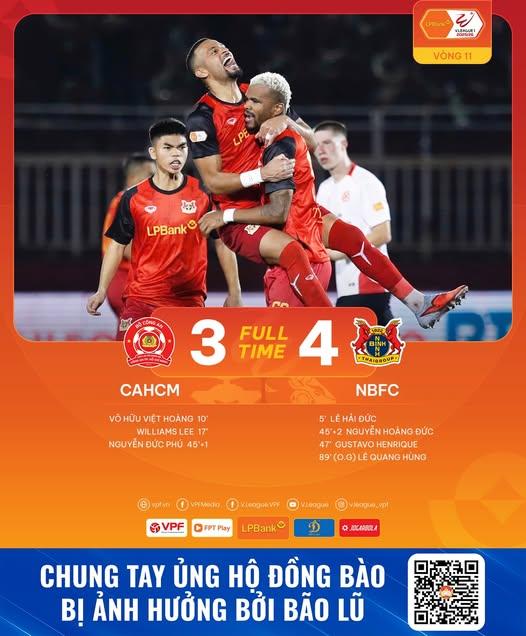 Geovane sent the ball into the penalty area, which found Lê Quang Hùng of Công an TPHCM, who mistakenly put it into his own net. The score increased to 4-3 in favor of Ninh Bình.