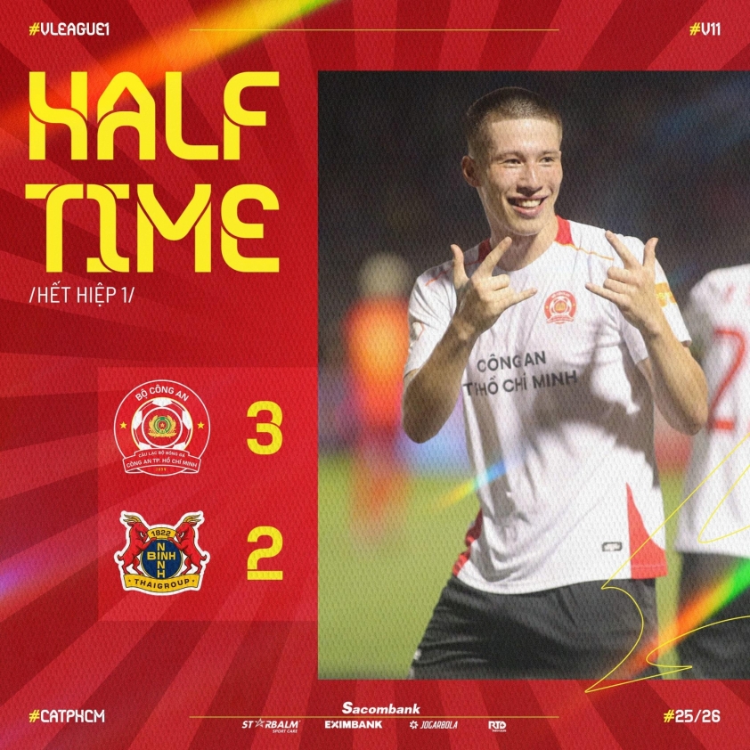 The action didn’t stop there; Lee Williams and Đức Phú scored consecutively, pushing Công an TPHCM ahead 3-1. However, Ninh Bình’s resilience showed again at the right moment. Hoàng Đức’s precise header before halftime cut the deficit, renewing hope for the visitors.