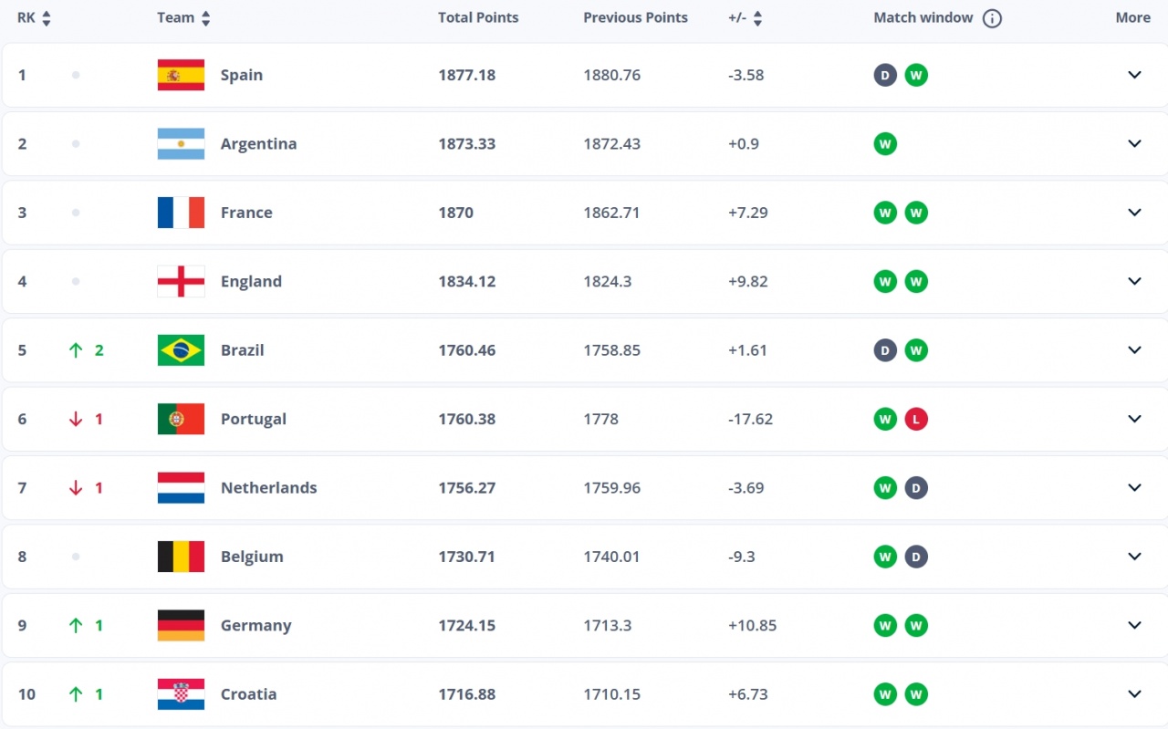 Home>soccerNews> FIFA's latest rankings: Spain, Argentina, France, and England remain firmly in the top 4; Brazil rises to 5th; Italy falls to 12th but still overrated. >