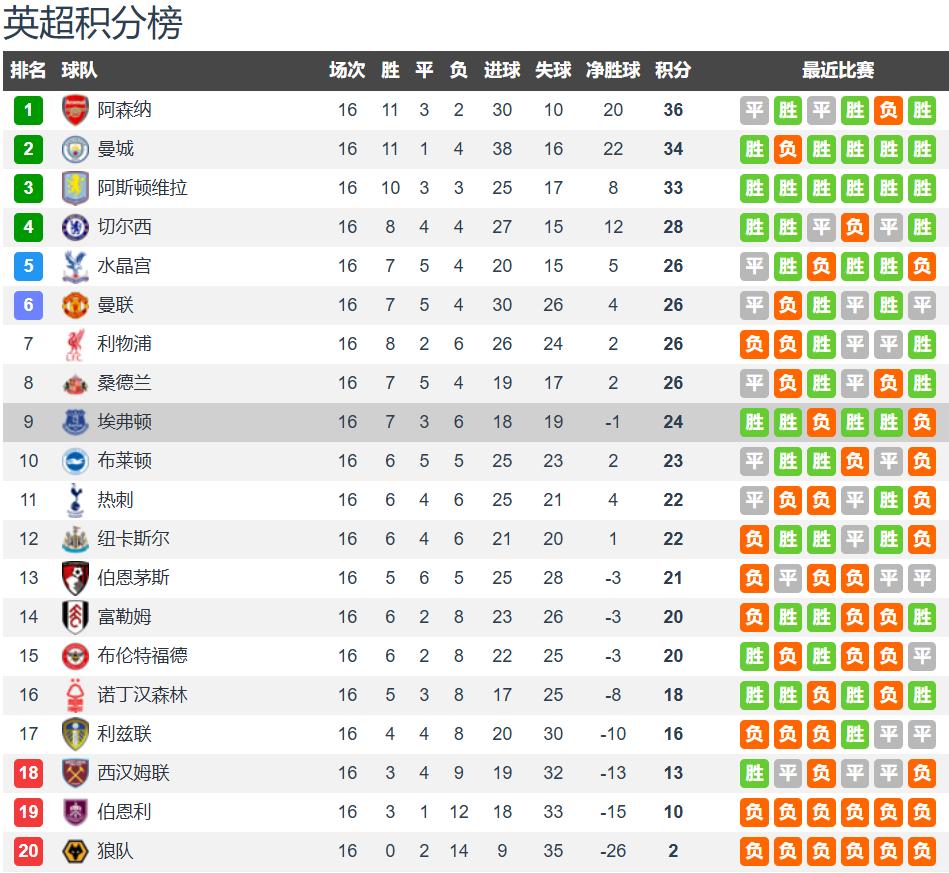 First:Team StatusAfter 16 rounds in the Premier League, Everton stands ninth with 7 wins, 3 draws, and 6 losses, accumulating 24 points. Arsenal leads the table with 11 wins, 3 draws, and 2 losses, totaling 36 points, just 2 points ahead of Manchester City. In the last round, Everton lost 0-2 away to Chelsea, ending their two-match winning streak; Arsenal narrowly won 2-1 at home against Wolves thanks to two own goals, continuing their streak of three consecutive home league matches without a victory.