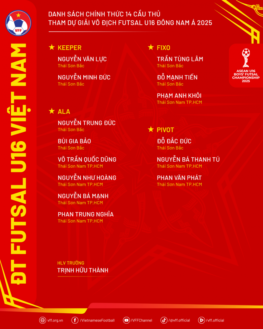 Prior to this, the team gathered for training starting November 16 at the Chanh Hung ward futsal arena (Ho Chi Minh City) with 20 called-up players, led by head coach Trinh Huu Thanh. After more than a month of preparation, the coaching staff finalized a 14-player roster before departure, ensuring team stability and competitiveness for the tournament.